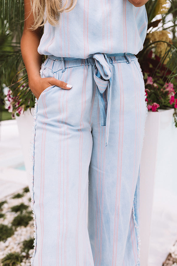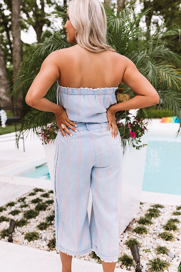 "Sooner or later" you're going to want to add this cute jumpsuit to your cart with its soft lightweight light wash chambray material, vertical neutral hued stripes, frayed raw cut seams and trim, an elastic off shoulder fit with a straight neckline, a cinched waistline with a tie belt, side pockets, and a relaxed pants silhouette that falls into straight mid-calf length hemlines! We have styled this unique piece with some white clear strap wedges, or it can be worn with "The Melina Faux Leather Heel in Latte," our "A Moment's Notice Crossbody in Blush," and our "Sipping In The Shade Sunnies in Blush!" Measurements