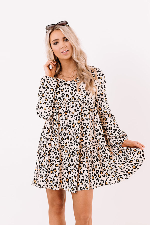 Put together an OOTD that you are guaranteed to love with our adorable cream colored 'Sounds Like Serendipity' dress featuring lightweight flowy material patterned with a black and camel colored leopard print, a scooped neckline, long bubble sleeves with elastic band cuffs, subtle ruffled accent trim, and an ultra relaxed tiered babydoll silhouette that falls into an uneven hemline! Measurements