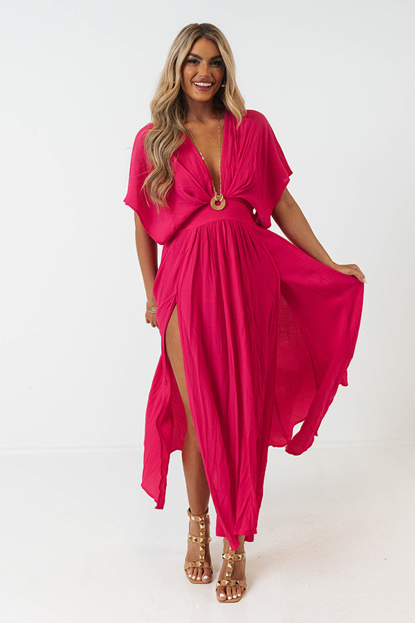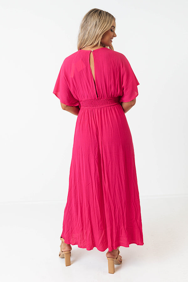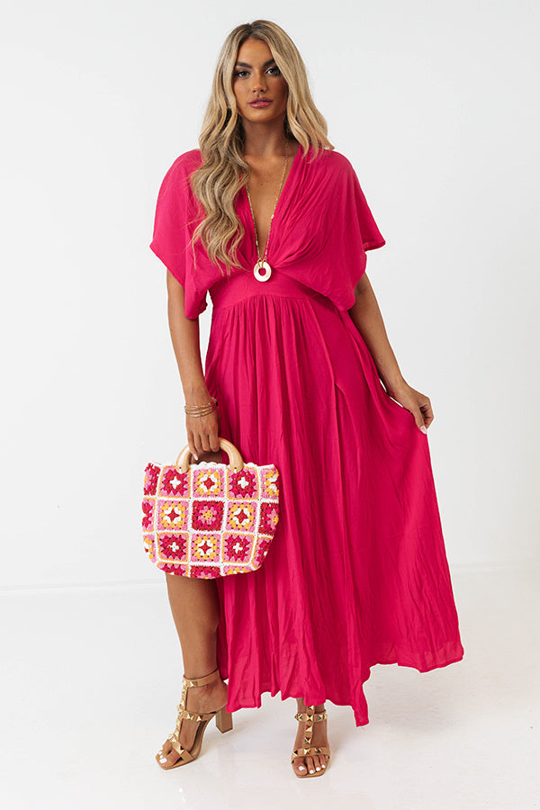 Get ready effortlessly in our breezy hot pink 'Soundtrack To The Summer Maxi' dress featuring lightweight material, a deep v-cut neckline, oversized bat wing sleeves, a fitted waistline, and a relaxed skirt silhouette that cascades into a straight ankle-length hemline with accent thigh-high slits!