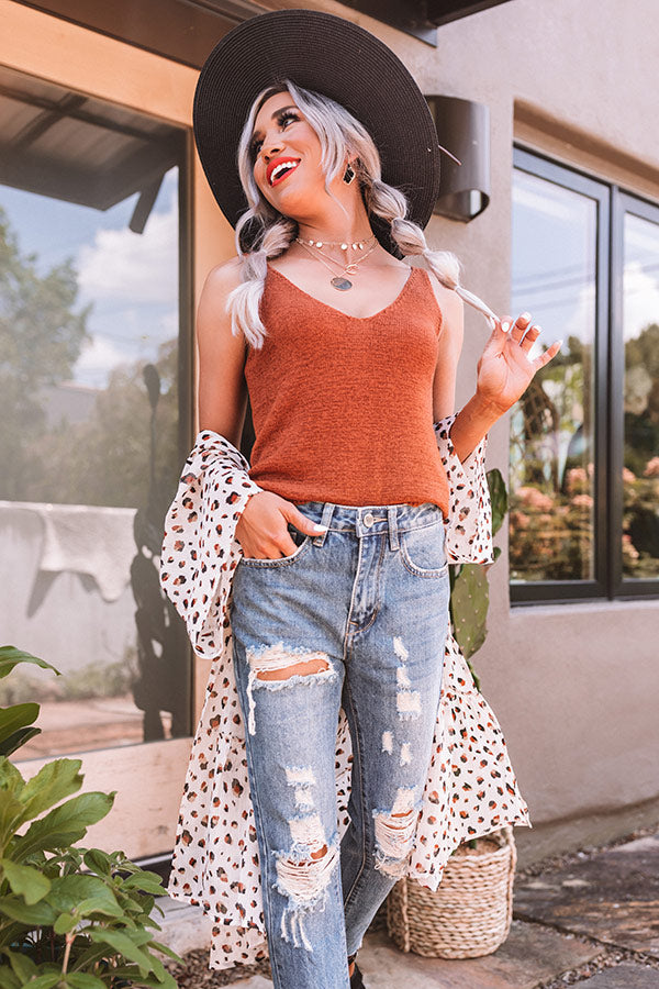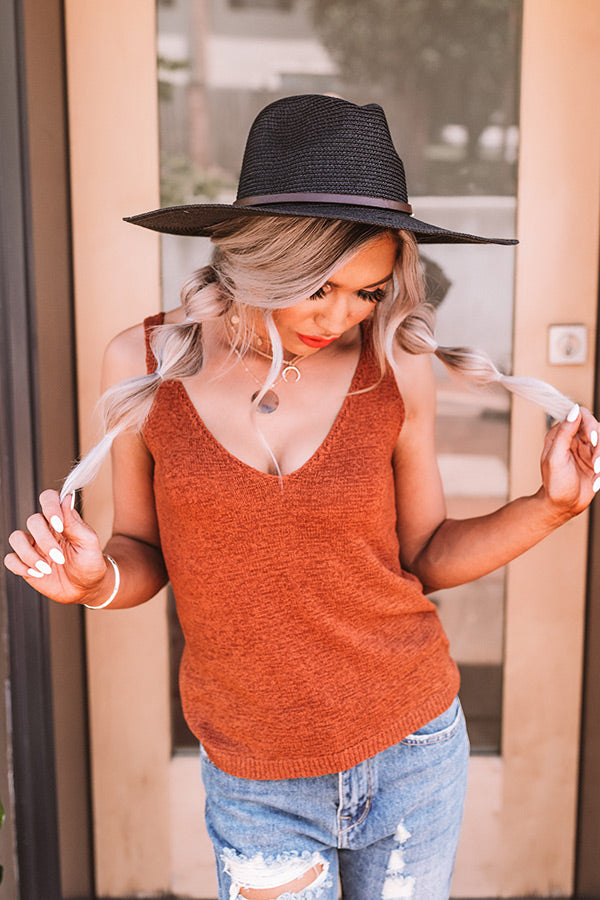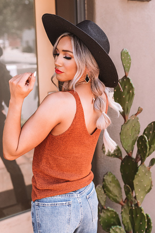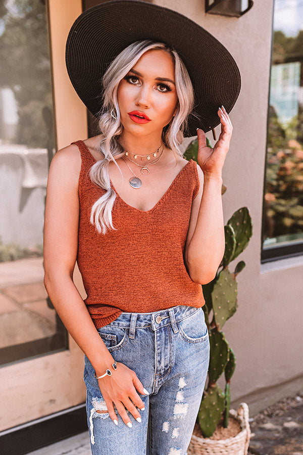 This upscale rust colored tank is sure to be a "source of style inspiration" with its soft lightweight tight knit material, v-cut neckline and upper back, 1-inch sleeveless shoulder straps, and figure flattering silhouette that falls into a straight hemline! We have layered this summer cutie under a leopard overlay with some distressed ankle skinnies and a black block heel and faux suede hat, but you can also wear it solo with some frayed white shorts, "The Alba Wedge in Rust," and our "Sand Castle Woven Tote in White!" Measurements