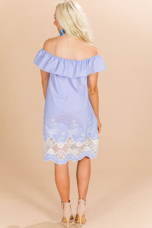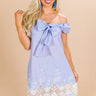 The "Southern Belle Off Shoulder Dress" is better than you could ever BOW-lieve! This blue & white striped beauty has an elasticized ruffled off-the-shoulder neckline that ties into a bow, a breezy shift silhouette & a gorgeous ivory embroidered bottom hem.
