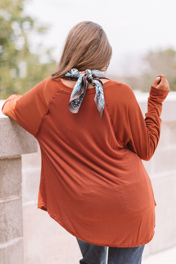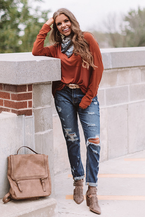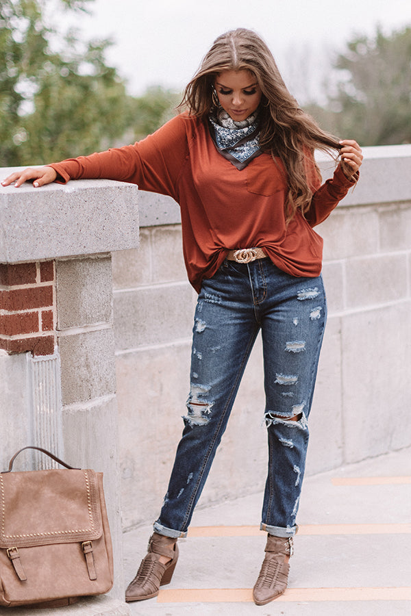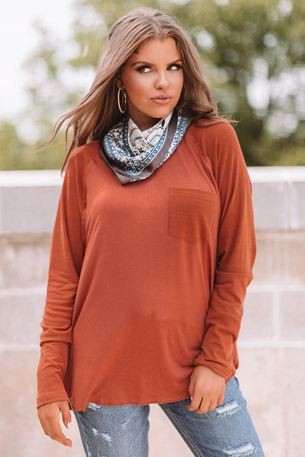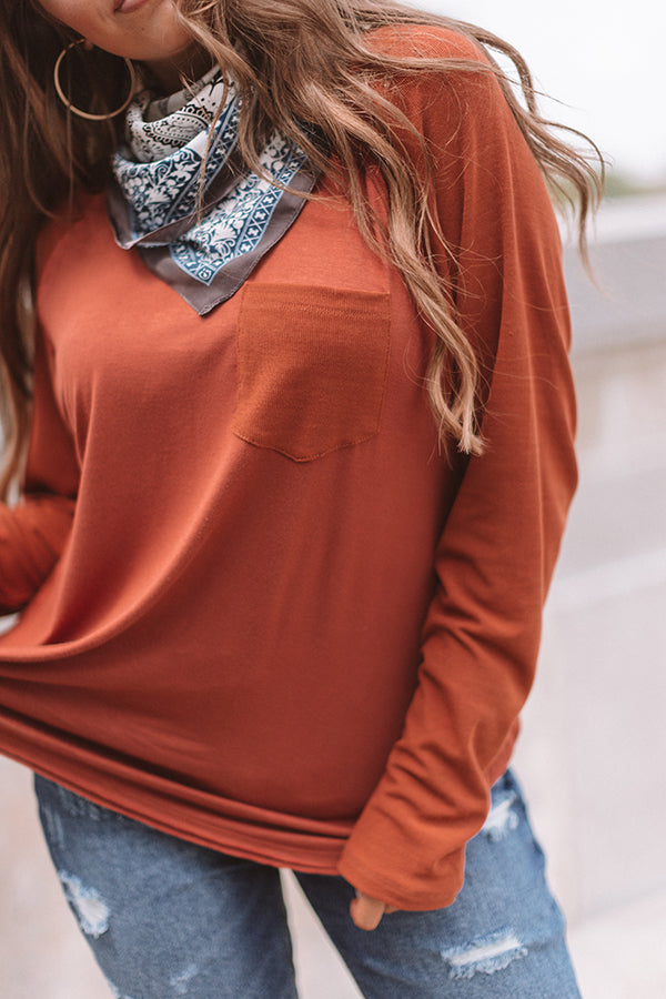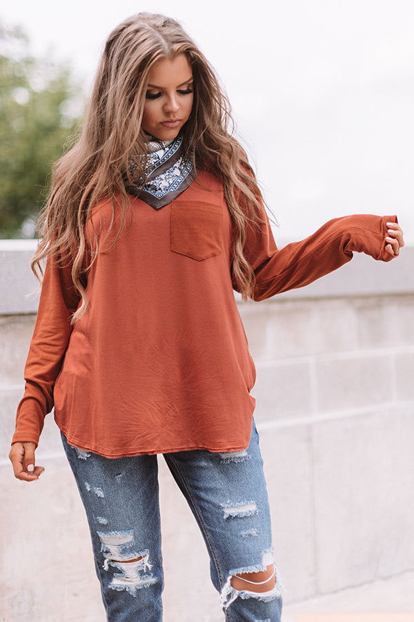 This rust shift top is sure to protect you from that chilly "southern breeze" with its soft warm material, long loose sleeves with subtle ribbed texturing, a high rounded neckline, a front accent pocket, exposed fresh cut seams, and an ultra relaxed bodice that falls into a straight hemline! Your styling options are endless with this fall basic, whether you style it with some distressed ankle skinnies, a neck scarf, and a neutral bootie and backpack, or under "The Walker Distressed Denim Jacket" with some black flares, a tan faux suede hat, and "The Seraphina Faux Leather Wedge in Brown" you are sure to have a trendy OOTD!