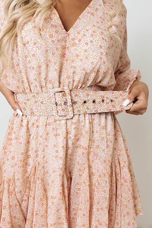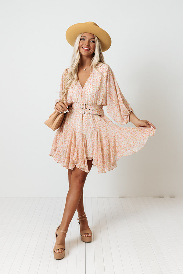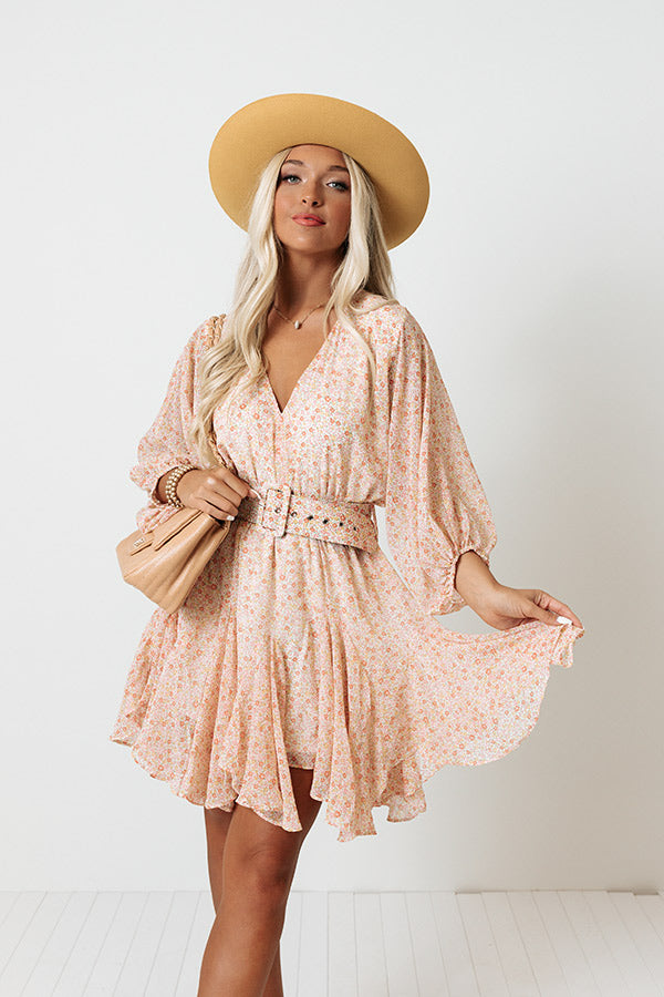 Add a southern flair to your wardrobe with this adorable dress featuring lightweight flowy material patterned with a small orange hued floral print, a v-cut neckline, 3/4-length bubble sleeves, a matching belt, and a relaxed silhouette that falls into an uneven oversized pleated mid-thigh length hemline! Measurements