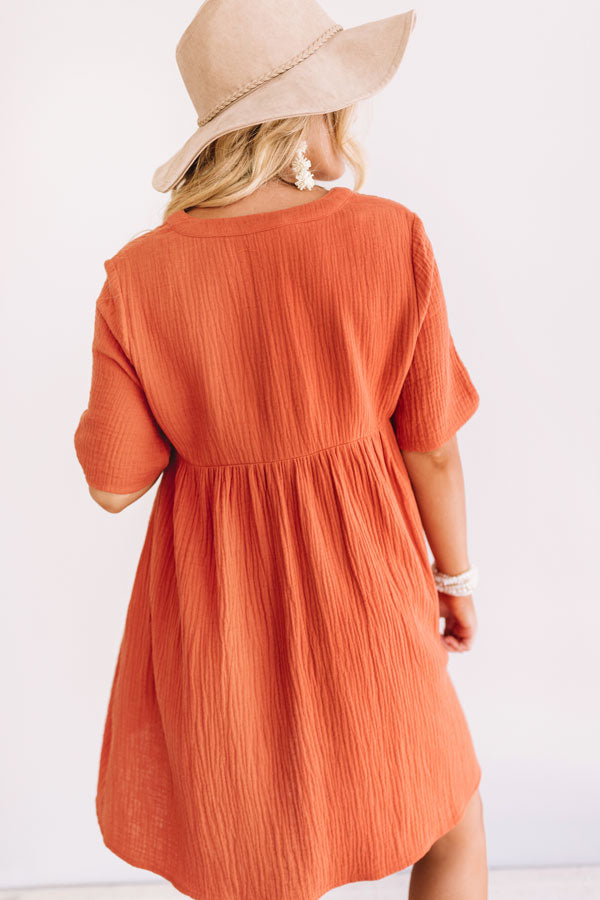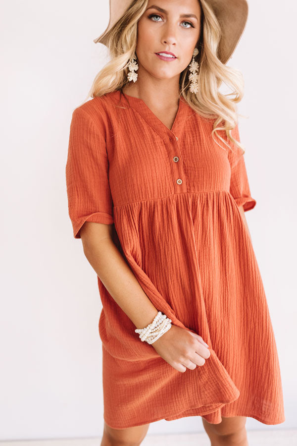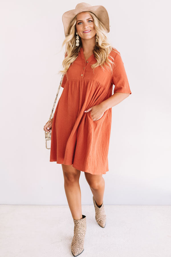 "Southern Saturday's" call for GAME DAY and we've found the perfect piece to show off you school spirit in with this pumpkin colored dress! It features a button up bodice with a v-cut neckline, a subtle ribbed texture, half-length sleeves, and a babydoll skirt that falls into a straight hemline! We have styled this trendy piece with leopard booties, a neutral faux suede hat, and a transparent crossbody, but you can also pair it with "The Jess Faux Leather Heel in Black" and our "Frequent Flyer Earrings in Black" for a variety of weekend looks that are sure to lead your team to a victory! Measurements