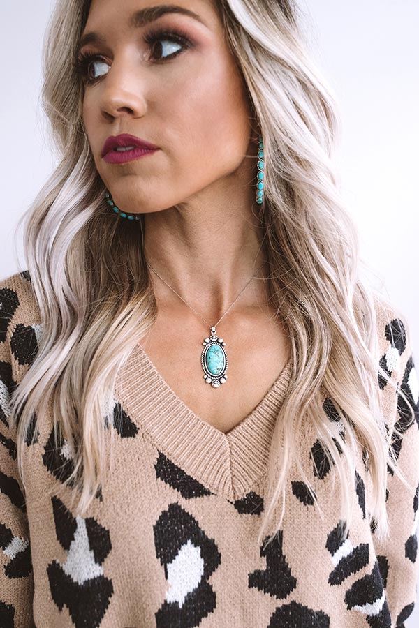 During those "southern Saturday's" there is no better piece to accessorize with than this statement necklace featuring a dainty silver chain and a large turquoise faux stone pendant!