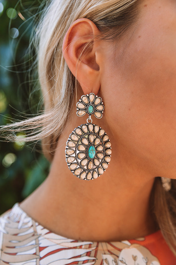 You are sure to look like a "southern sweetheart" when you accessorize with these adorable statement earrings featuring ivory colored faux stone flower shaped studs and large dangling circle pendants!