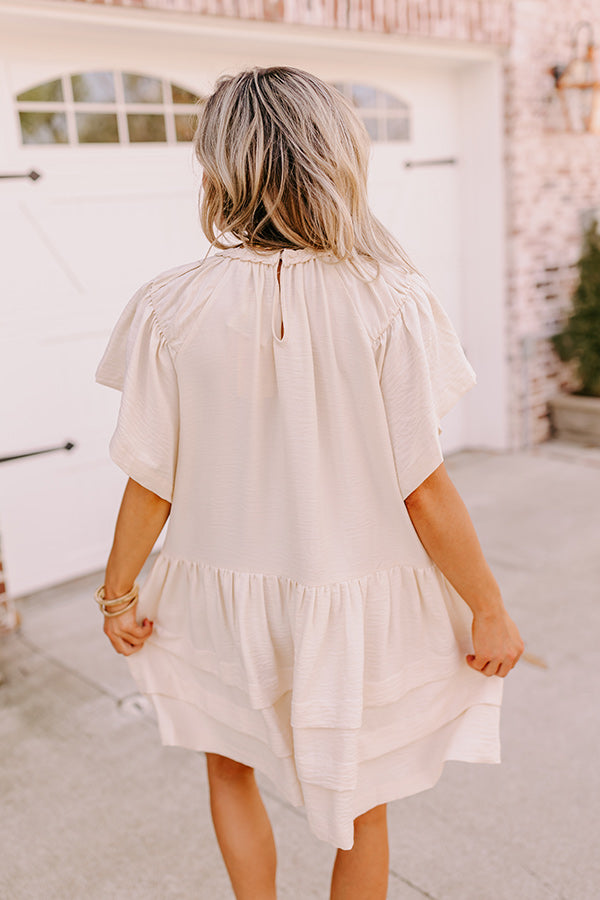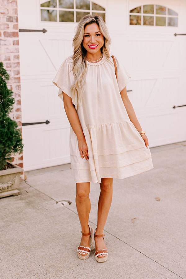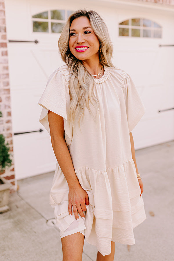 - A flowy tiered silhouette that ends in a mini dress length hemline