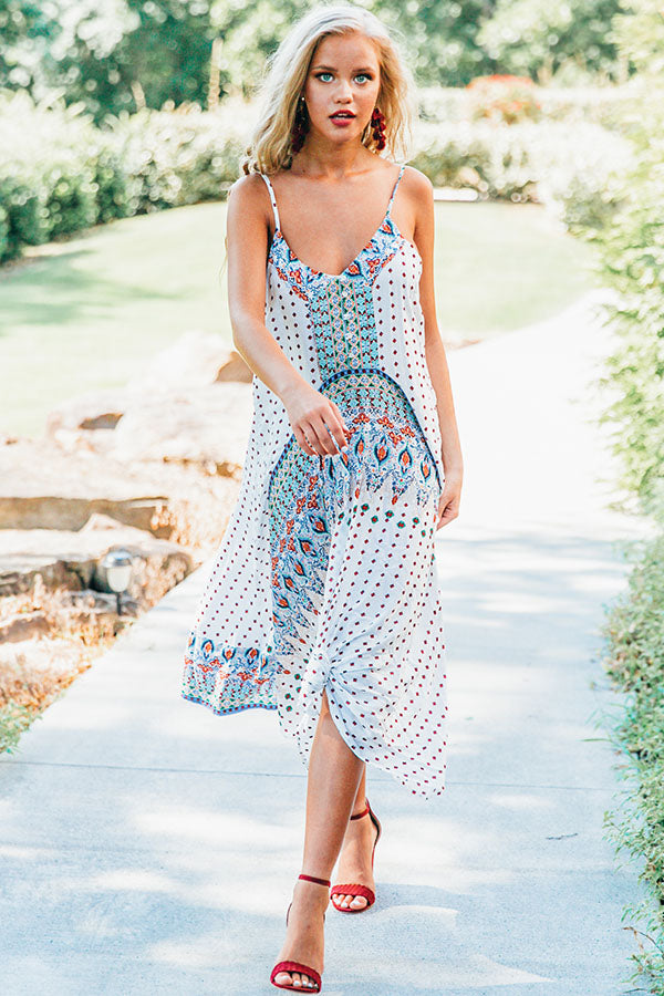 Coast through Summer in this effortlessly chic midi dress! This paisley printed midi dress has thin adjustable straps, a button-down bodice & an ultra relaxed rayon silhouette with a tiered sided midi length hem. Add a pop of color to your look with a wine statement earring & heel; Or add a cropped denim jacket to your look to carry this look into Fall!
