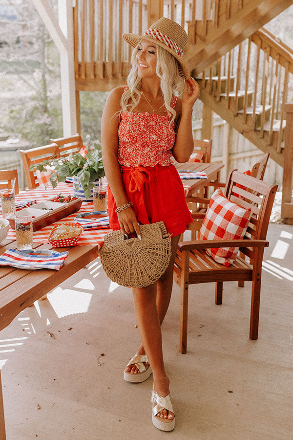 Spend your summer in style with our cute red 'Sparkler Season' top featuring a four-way stretch smocked bodice patterned with a cute white print, a straight neckline and upper back with 1-inch sleeveless shoulder straps, and a flattering figure hugging silhouette that ends in a straight hemline! on products