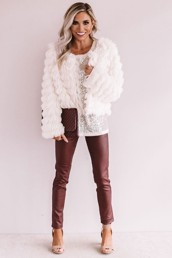 Show off your "sparkling personality" with this eye-catching champagne colored shift top featuring lightweight material covered in shimmering sequins, white trim detailing, a high rounded neckline, short loose sleeves, and a relaxed silhouette that falls into a straight hemline! We have styled this party piece under a faux fur jacket with some colored faux leather leggings and simple nude heels, but you can also wear it with our black "Stylists' Pick Faux Leather Skirt," black over the knee boots, our "All Caught Up Headband in Black," and our "Sleek In The City Clutch in Iced Latte!" Measurements
