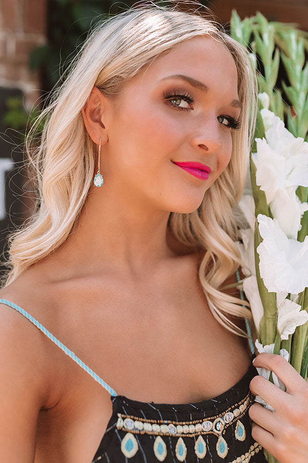 These divine earrings feature a long golden post with a sparkling aqua tear drop crystal!