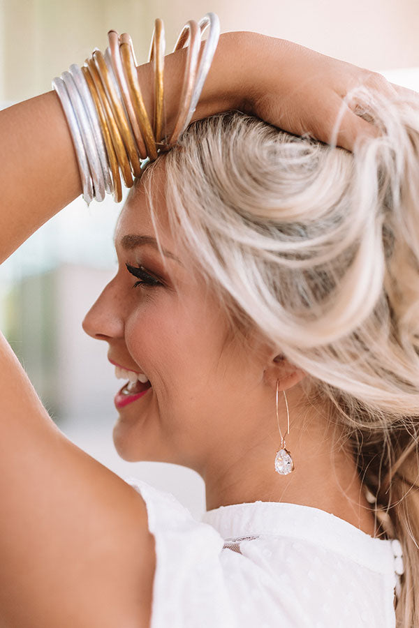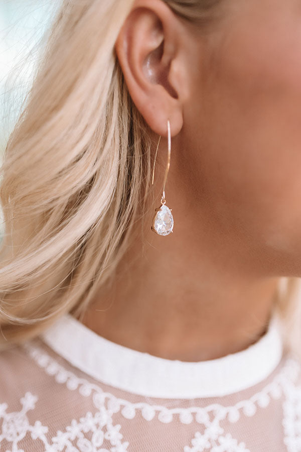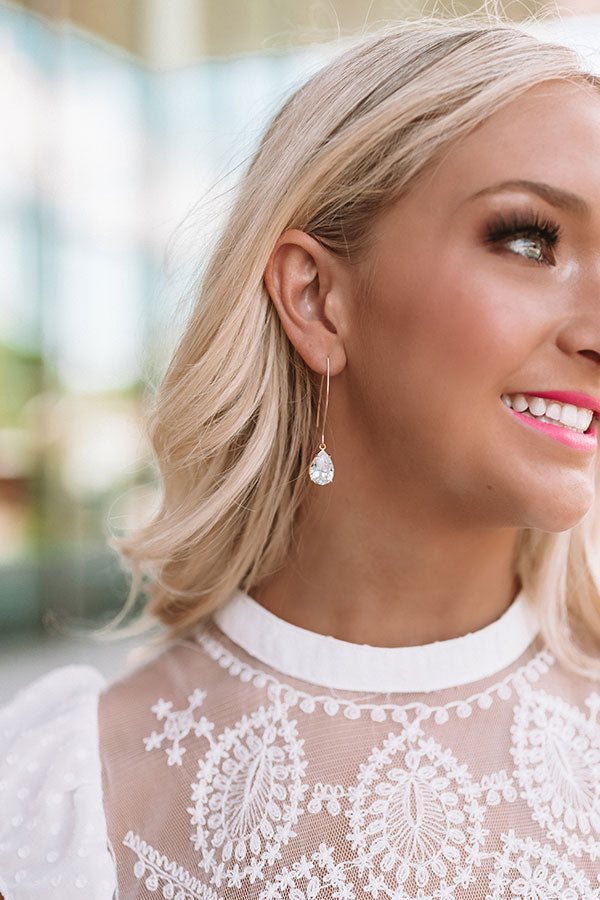 These divine earrings feature a long golden post with a sparkling clear tear drop crystal!