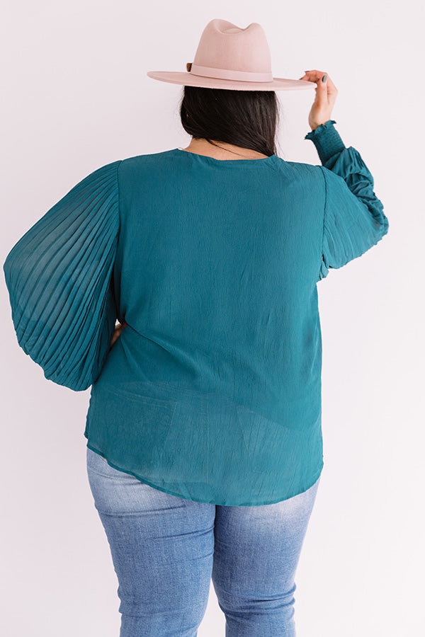 Plus Size - You can never be overdressed in our charming teal colored "Sparks And Kisses Shift Top" featuring ultra lightweight material, a high v-cut neckline, long oversized bishop sleeves with fitted smocked cuffs and pleated detailing, and a relaxed silhouette that falls into an uneven hemline!
