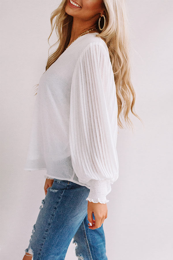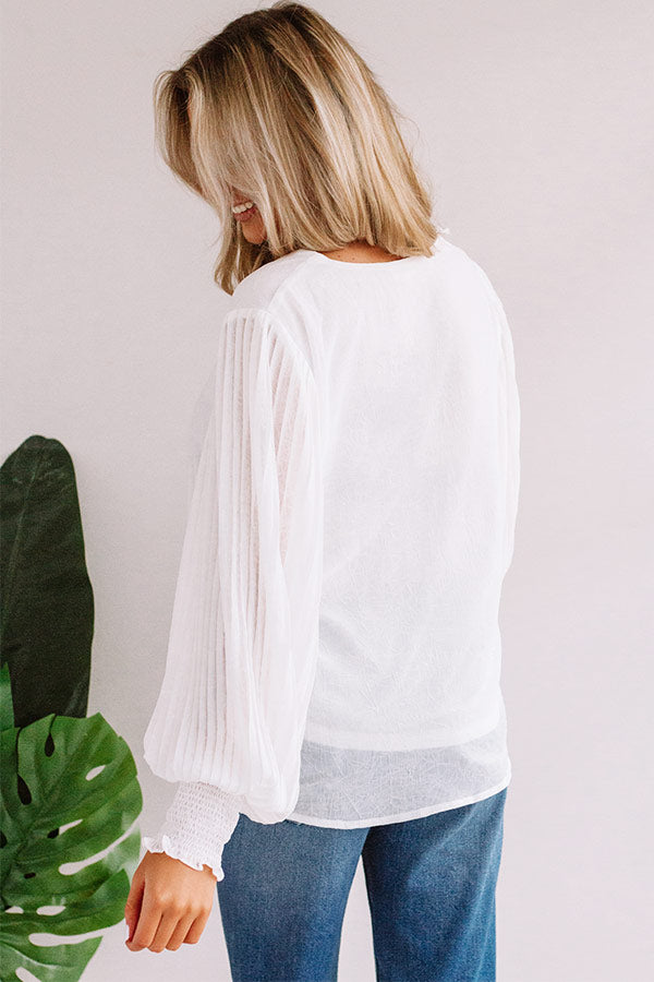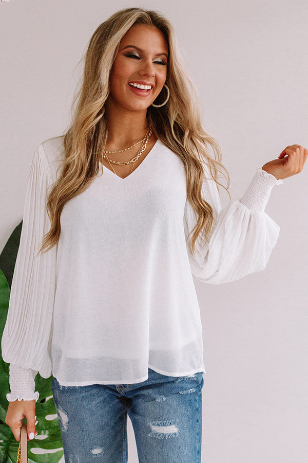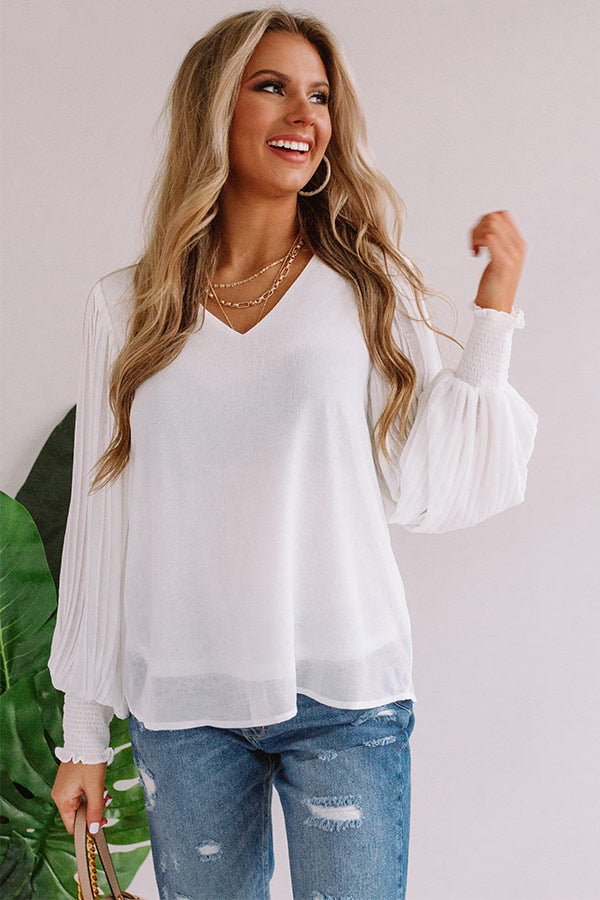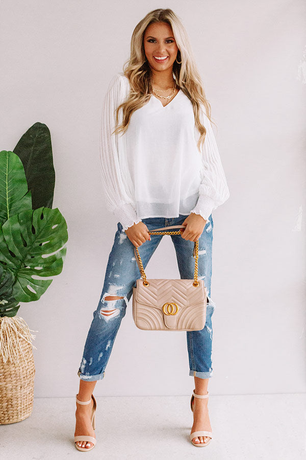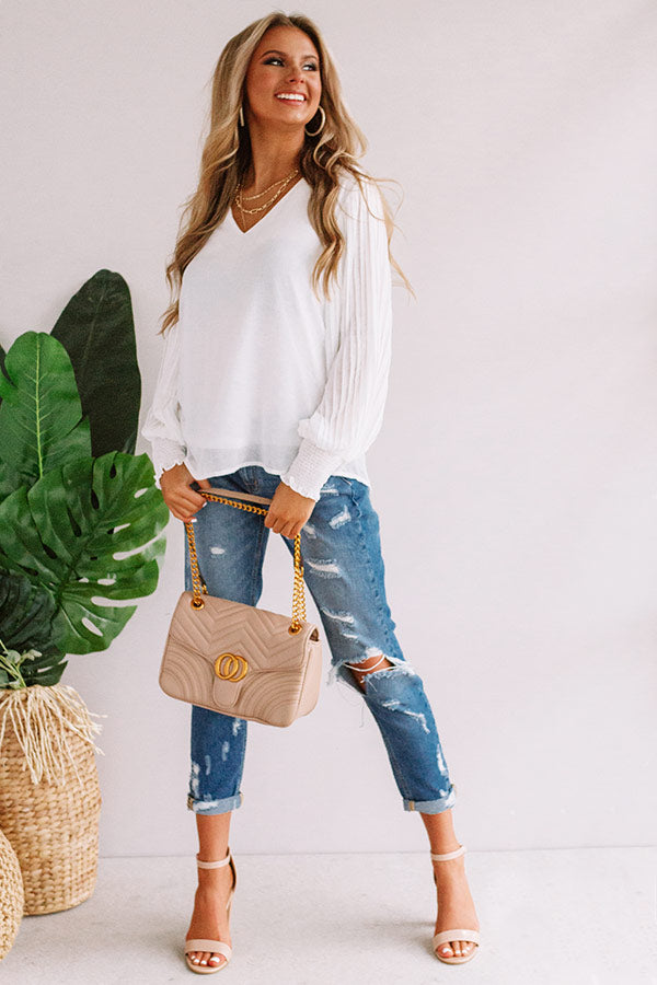 You can never be overdressed in our charming white "Sparks And Kisses Shift Top" featuring ultra lightweight material, a high v-cut neckline, long oversized bishop sleeves with fitted smocked cuffs and pleated detailing, and a relaxed silhouette that falls into an uneven hemline! We have styled this adorable piece withs some distressed ankle skinnies and a neutral heel and crossbody, but you can also wear it front tucked into some frayed jean shorts, "The Lela Espadrille in White," and our "Start It Up Hair Scarf!" Measurements