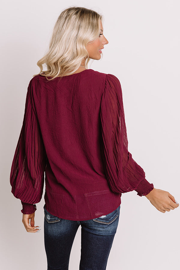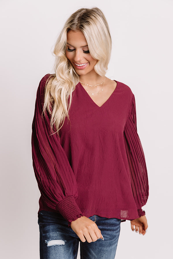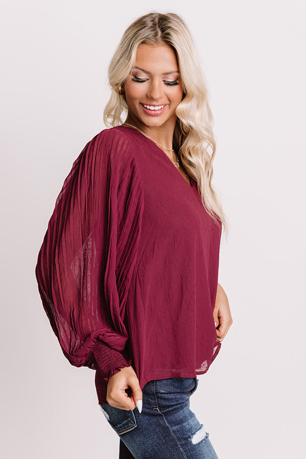 You can never be overdressed in our charming dark wine colored "Sparks And Kisses Shift Top" featuring ultra lightweight material, a high v-cut neckline, long oversized bishop sleeves with fitted smocked cuffs and pleated detailing, and a relaxed silhouette that falls into an uneven hemline! Measurements