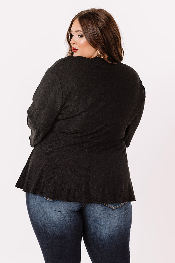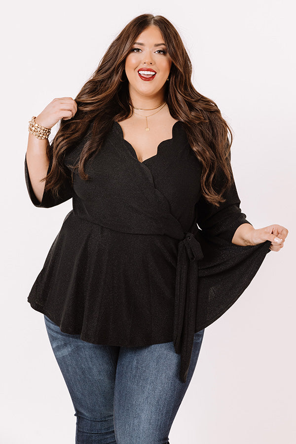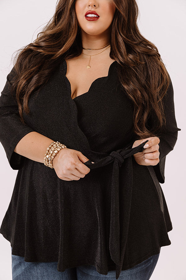 Plus Size - You won't need to wait for a "special night" to wear this everyday essential! This casual cute black top features lightweight material, a v-cut neckline with scalloped trim detailing, loose 3/4-length sleeves, a tie belt waistline, and a flattering silhouette that falls into an uneven hemline! Measurements