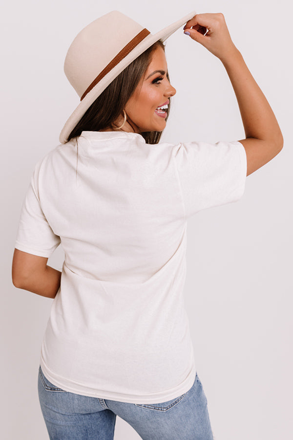 Add a little spice to your wardrobe with this festive white tee featuring soft lightweight material with orange hued lettering on the front, a high rounded neckline, short loose sleeves, and a relaxed silhouette that falls into a straight hemline!