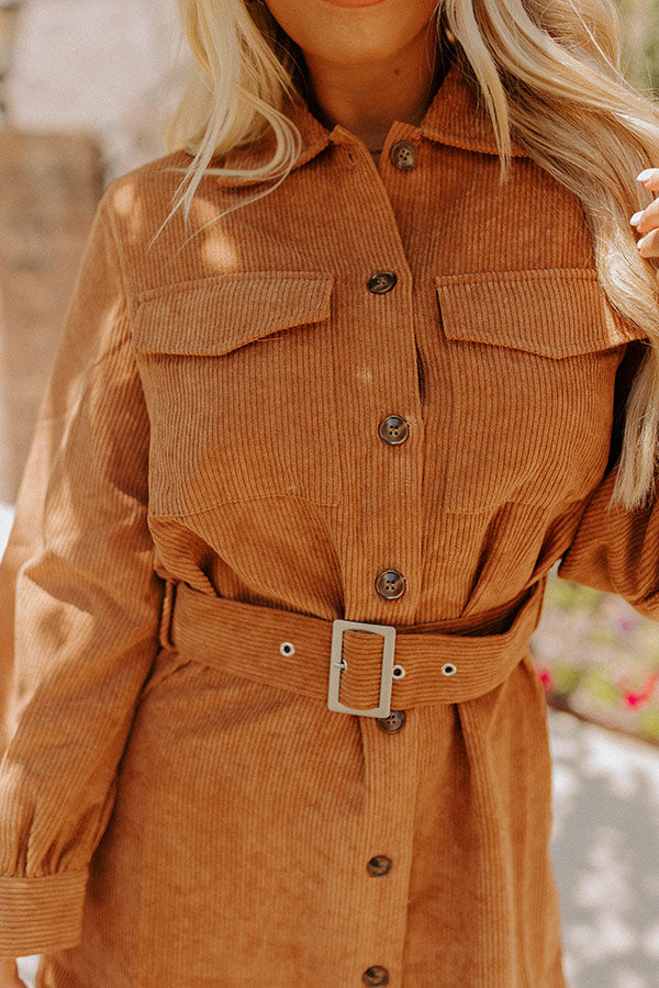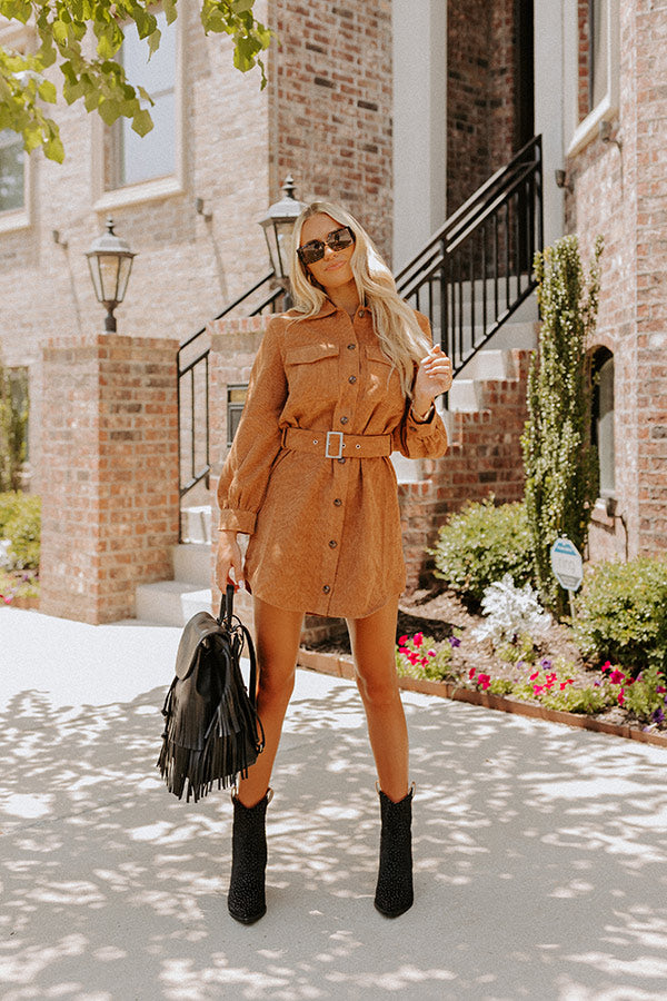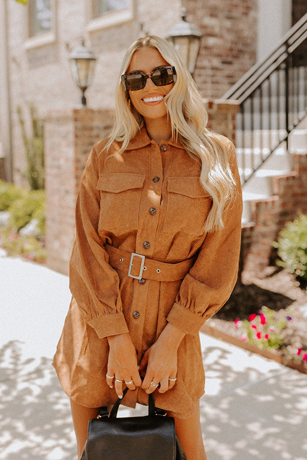 Transition from summer to fall with ease in our adorable camel colored 'Spiced Latte Love' dress featuring lightweight corduroy material, a button down front with a collared neckline, long loose sleeves with button closure cuffs, two accent chest pockets with flap closures, a matching accent belt, and a relaxed silhouette that falls into a rounded mid-thigh length hemline!