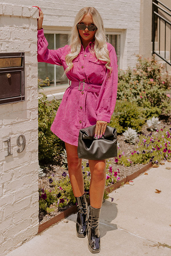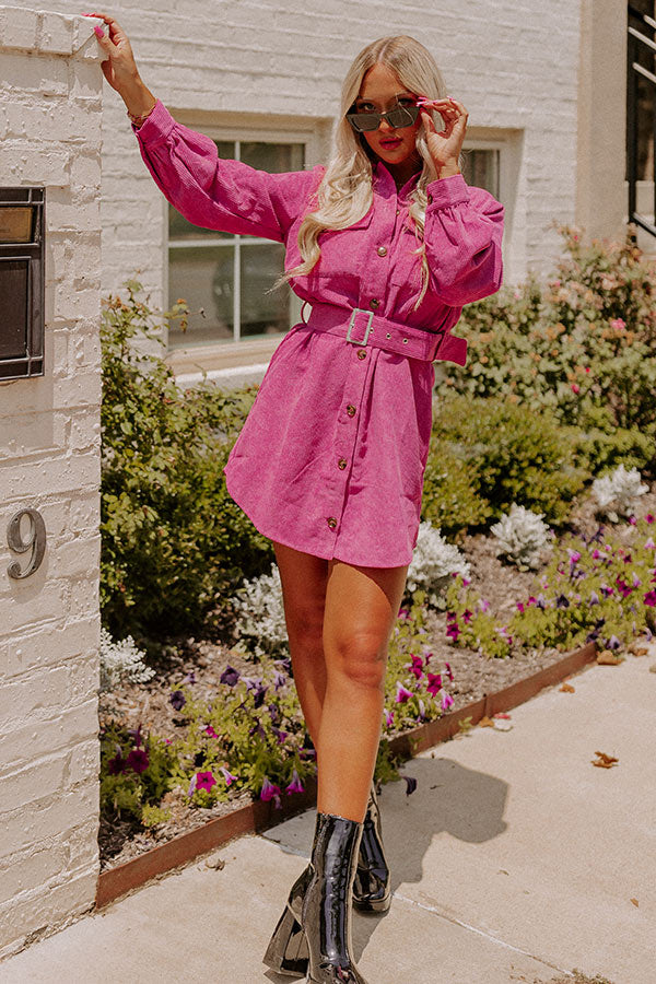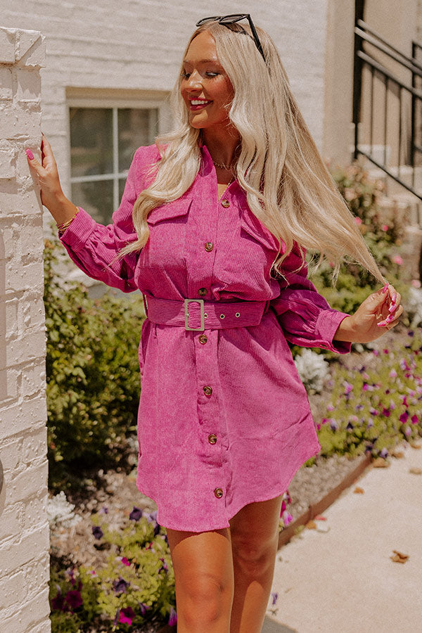 Transition from summer to fall with ease in our adorable vineyard grape colored 'Spiced Latte Love' dress featuring lightweight corduroy material, a button down front with a collared neckline, long loose sleeves with button closure cuffs, two accent chest pockets with flap closures, a matching accent belt, and a relaxed silhouette that falls into a rounded mid-thigh length hemline!