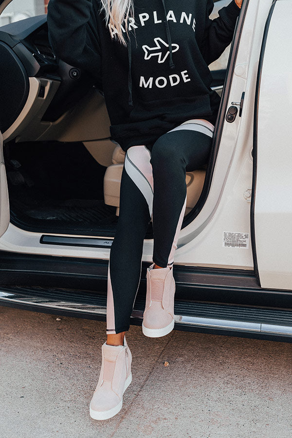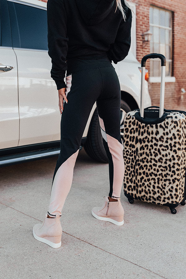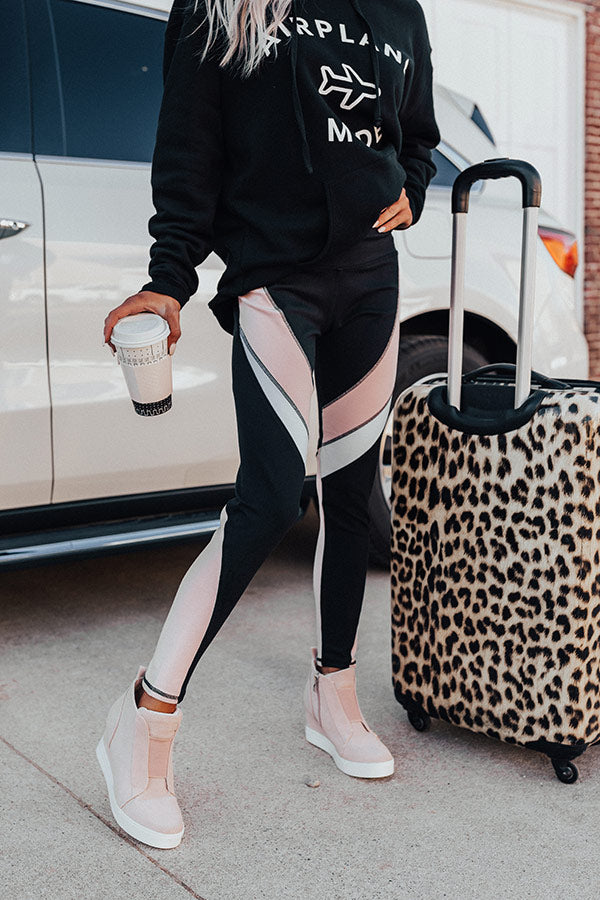 Our sporty black "Spin And Spritzers" active legging features sleek stretchy material with a figure hugging fit, light pink and white color block panels, a high elastic waistband, and a sleek pant silhouette that falls into straight ankle length hems! This adorable athleisure piece styles perfectly with a variety of sports bras or tank tops and trendy sneakers for the ultimate workout set! Measurements
