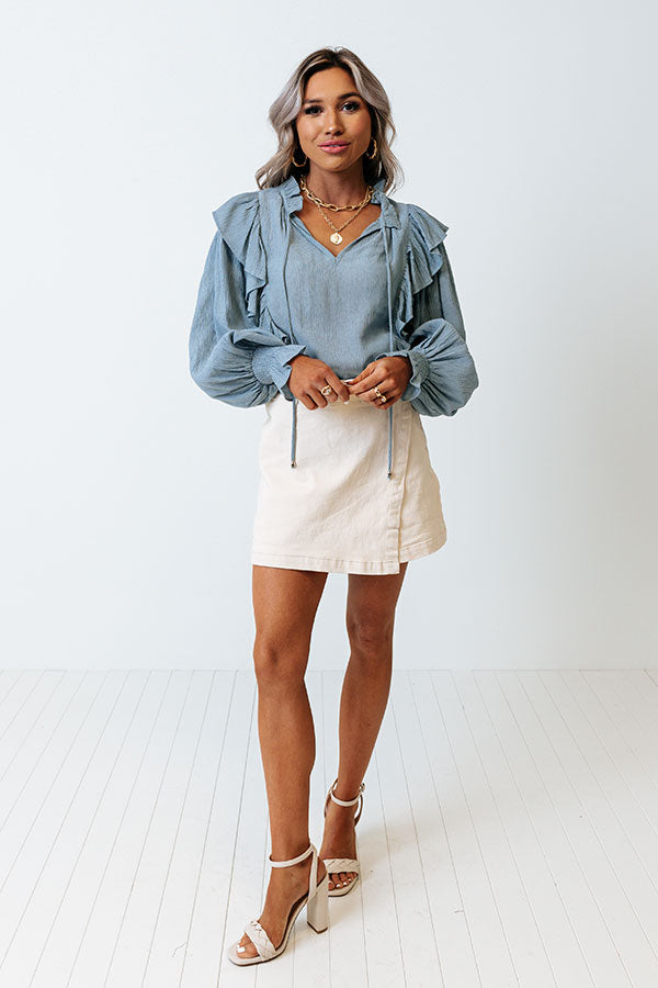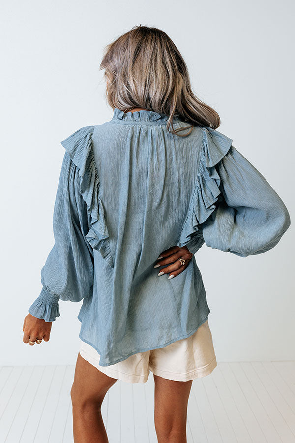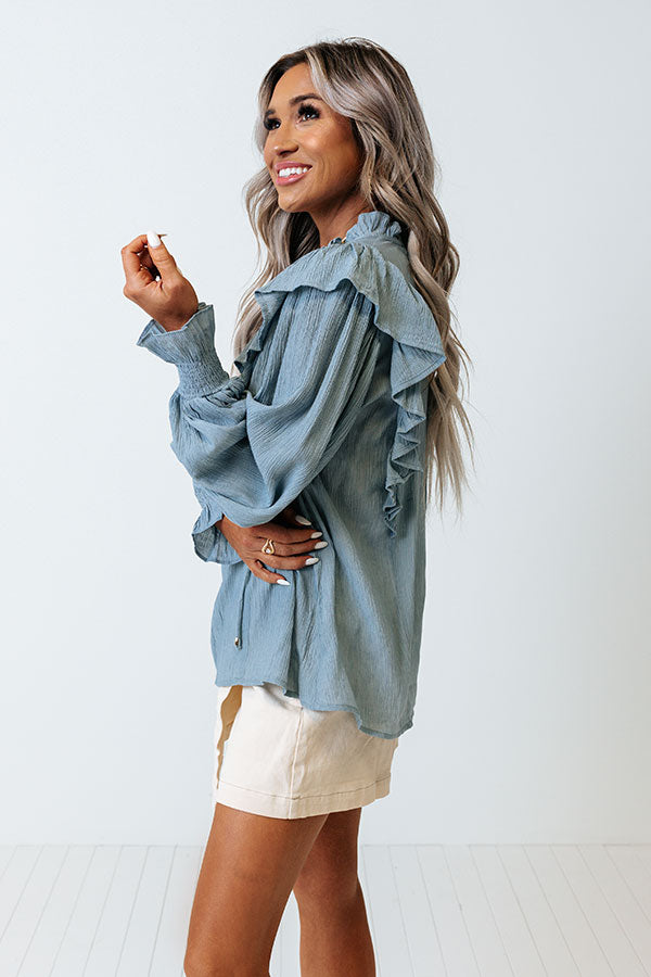 You are sure to look splendid in this chic airy blue top featuring lightweight material with ruffled detailing, a v-cut neckline with a tie closure, long bubble sleeves with smocked cuffs, and a relaxed silhouette that falls into a straight hemline! on products