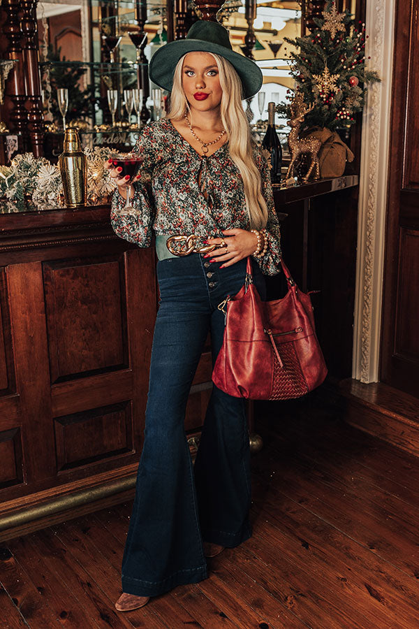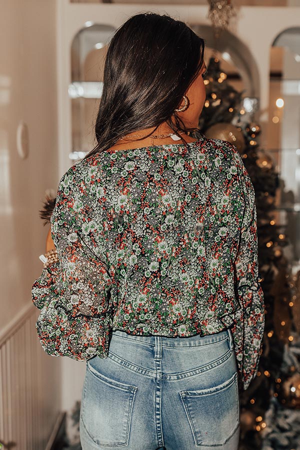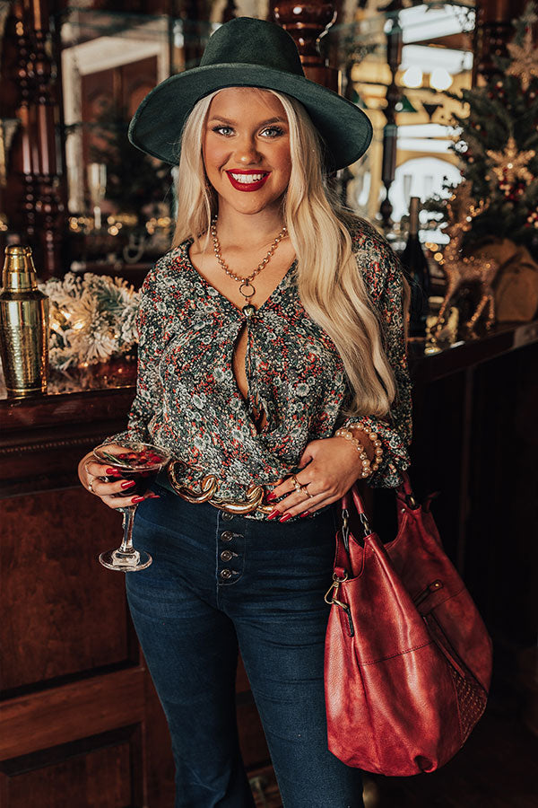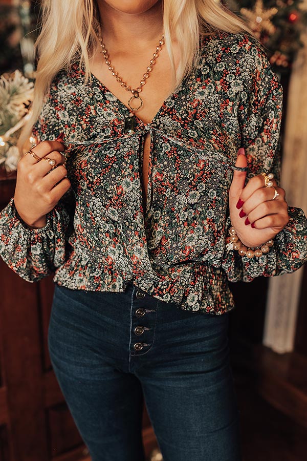 It will be a splendid style moment when you complete your look with this beautiful top featuring lightweight material patterned with a pretty green and wine hued floral print, a faux wrap bodice with a tie closure, long oversized sleeves, and a relaxed silhouette that falls into a smocked hemline with ruffle trim detailing!