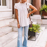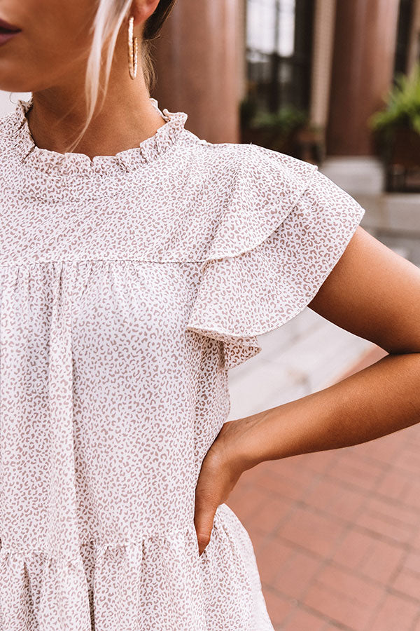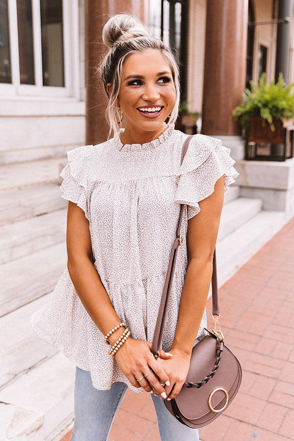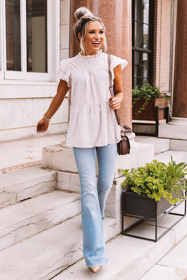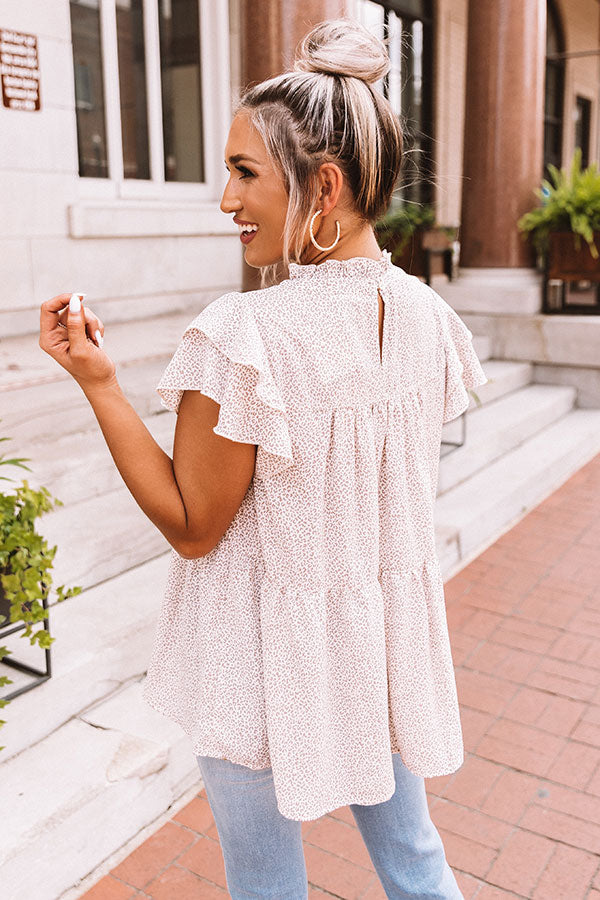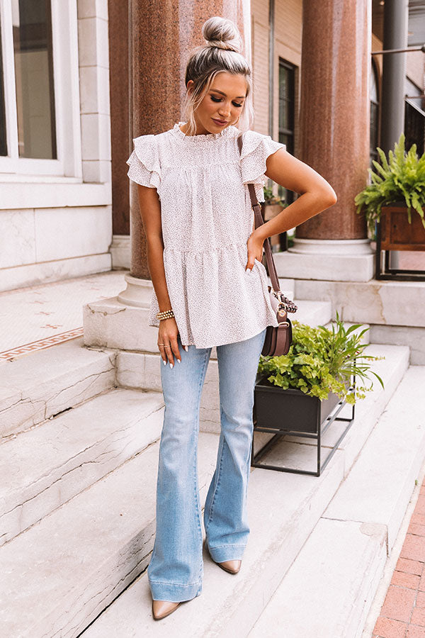 Show off your splendid style with this darling taupe colored shift top featuring lightweight flowy material patterned with a small white spotted print, a high subtle ruffled neckline, tiered ruffle cap sleeves, a keyhole accented upper back with a button closure, and a relaxed silhouette that falls into a straight hemline! Measurements