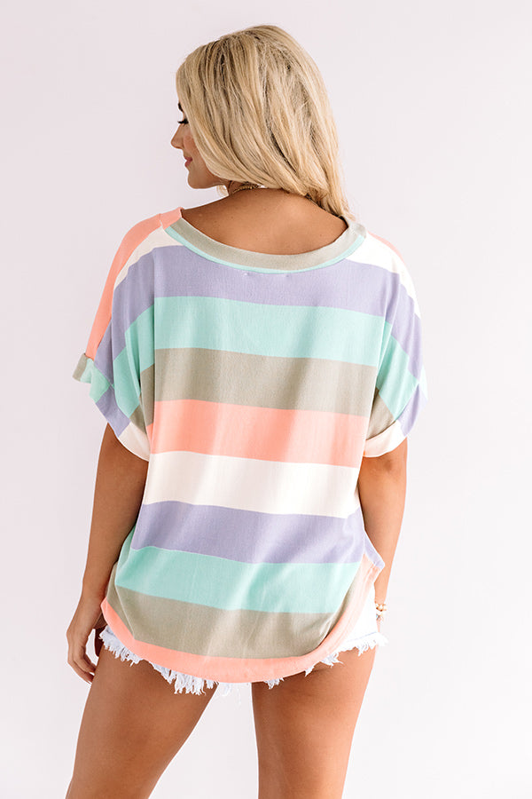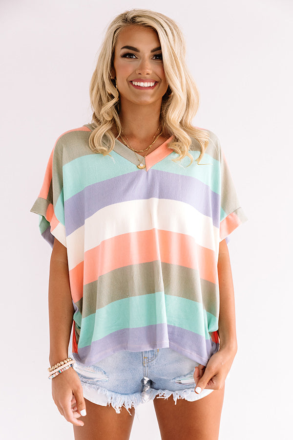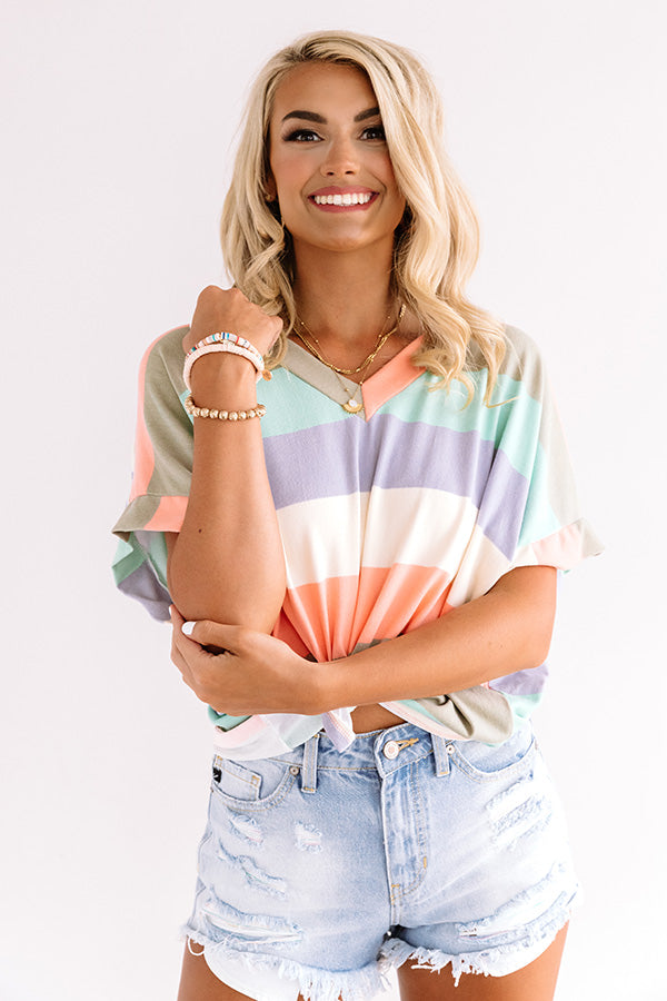 "Stripe" a pose in our adorable sage colored "Splendid Times" shift tee featuring soft lightweight material patterned with horizontal pastel accent stripes, a high v-cut neckline, short loose sleeves with ruffled trim detailing, and a relaxed silhouette that falls into a rounded hemline that can be knotted! We have styled this casual cutie with some distressed shorts and neutral wedges, but you can also wear it with some white flares, "The Lula Heel in Lavender," our matching "Had Me At Happy Hour Clutch," and our "Laying Out In Laguna Woven Hat!" Measurements