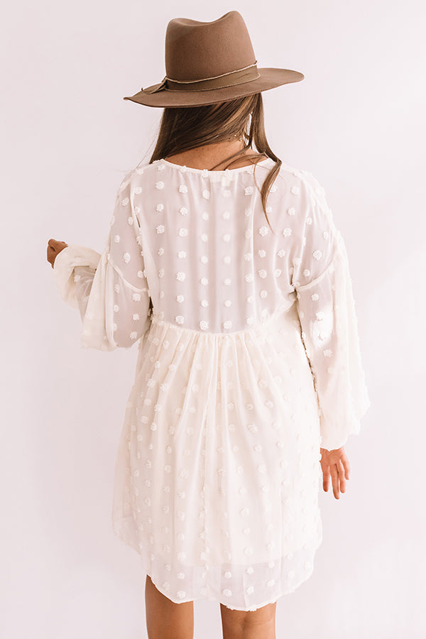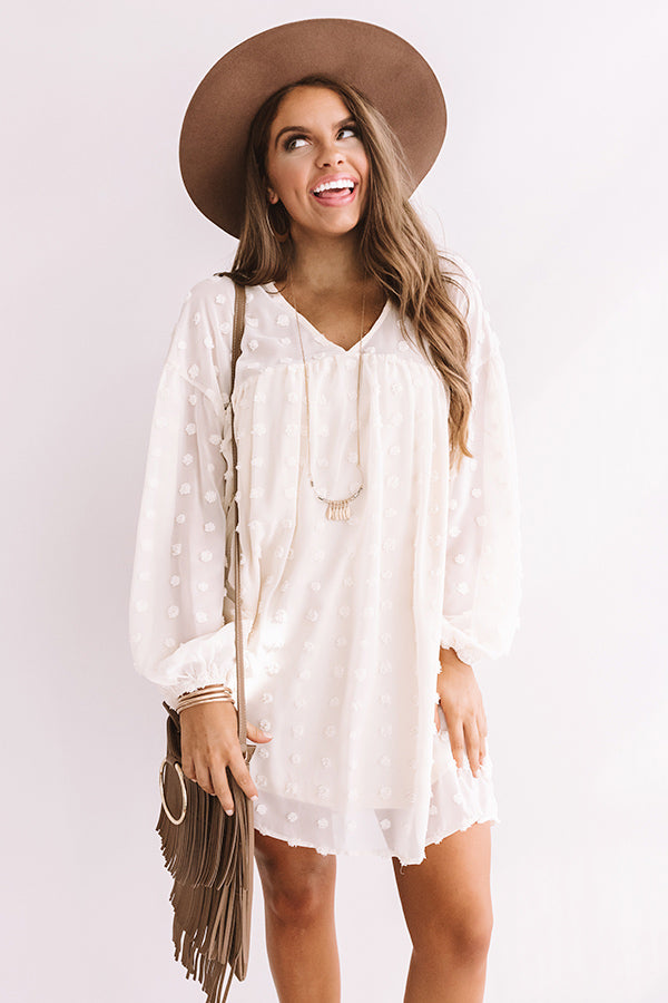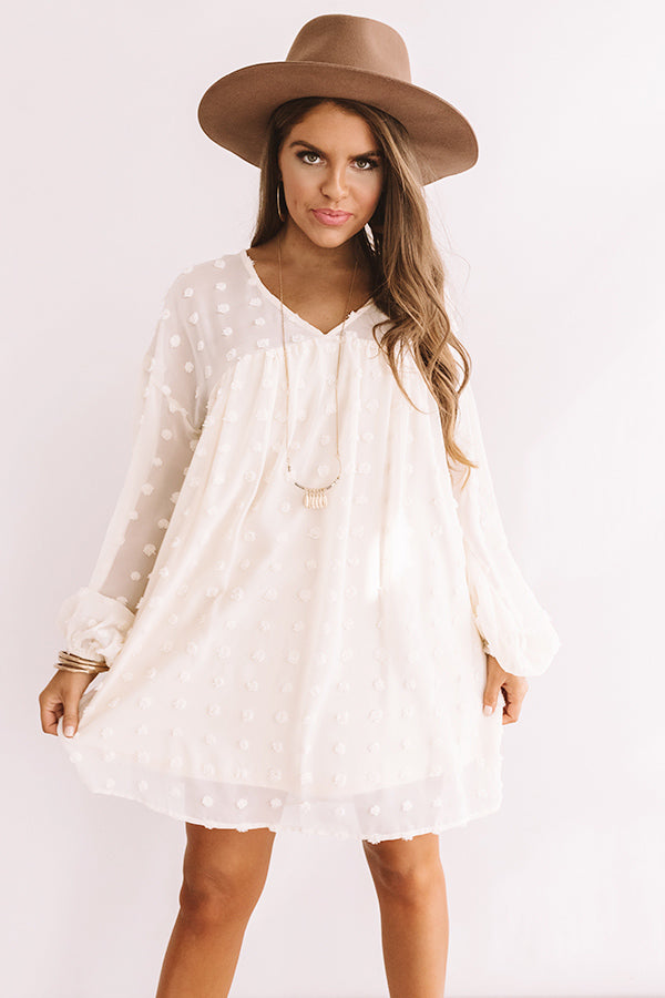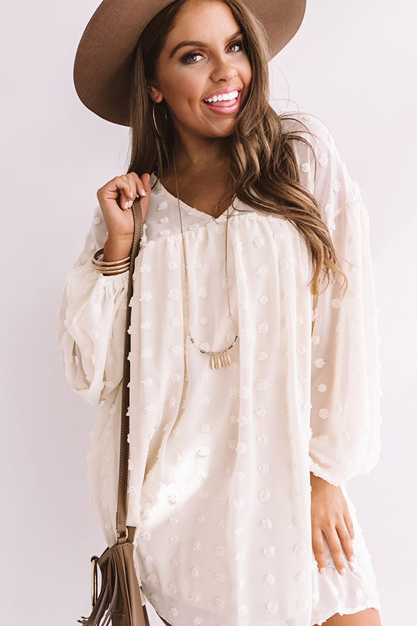 This cream colored shift dress is "spot on" with this years fall trends! It features lightweight semi sheer material with an accent polka dot knit pattern, a v-cut neckline, long oversized bishop sleeves with fitted elastic banded cuffs, and a relaxed babydoll silhouette that falls into an uneven mid-thigh length hemline! PLUS, it comes with a sewn in slip! We have styled this piece with some snake print booties and a neutral fringe crossbody and faux suede hat, but you can also wear it with colored accessories like "The Brinkley Heel" and our "Stargazing Earrings in Wine!" Measurements