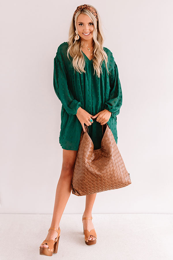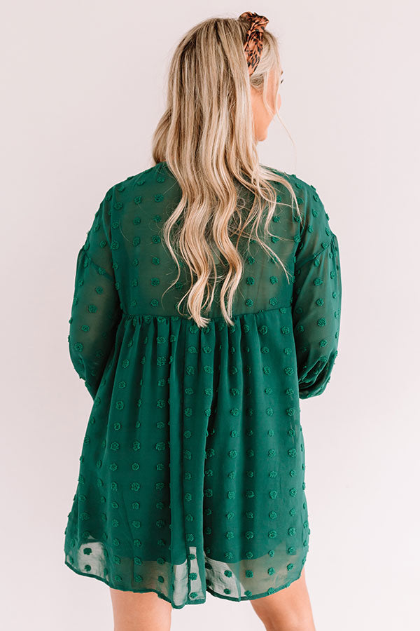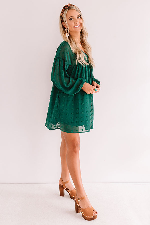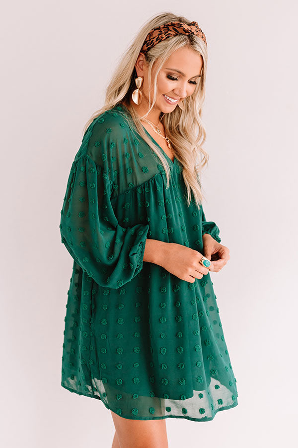 This hunter green colored shift dress is "spot on" with this years fall trends! It features lightweight semi sheer material with accent polka dot pattern texturing, a v-cut neckline, long oversized bishop sleeves with fitted elastic cuffs, and a relaxed babydoll silhouette that falls into an uneven mid-thigh length hemline! PLUS, it comes with a sewn in slip! Measurements