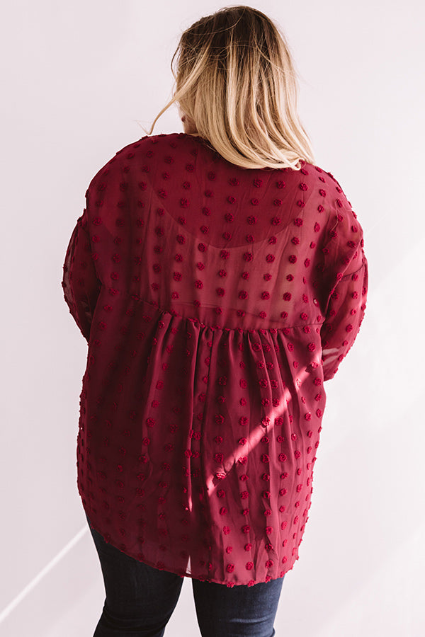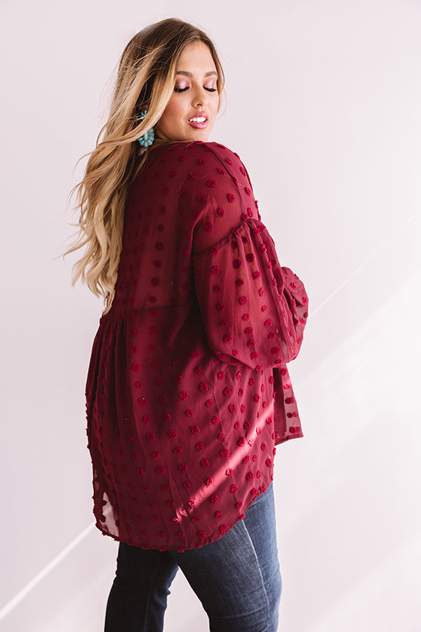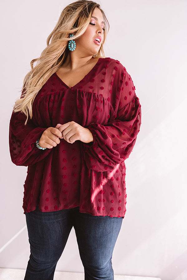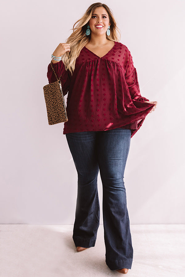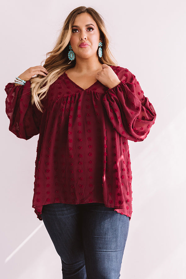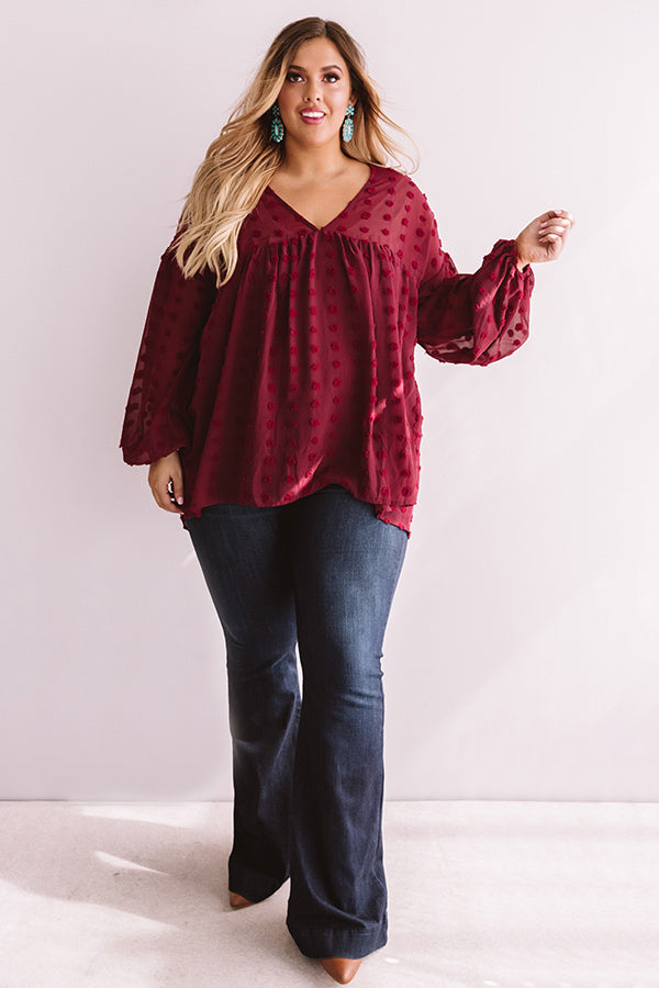 Plus Size - This wine colored top is "spot on" for this falls trends! It features a lightweight semi sheer fabric with an accent knit polka dot pattern, a v-cut neckline, long loose bishop sleeves with elastic banded cuffs, and a relaxed babydoll silhouette that falls into a rounded hemline! This casual but gorgeous piece styles beautifully with some dark wash flares, turquoise accent jewelry, neutral booties, and a leopard clutch, but it also pairs perfectly with some charcoal flares, "The Seraphina Faux Leather Wedge in Grey," and our "Classic Moment Wool Hat in Dark Grey!" Measurements