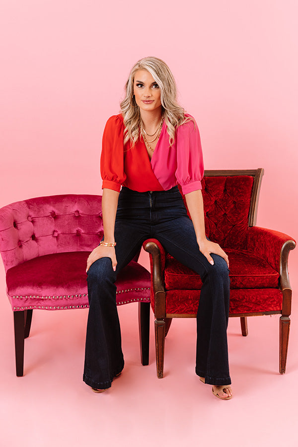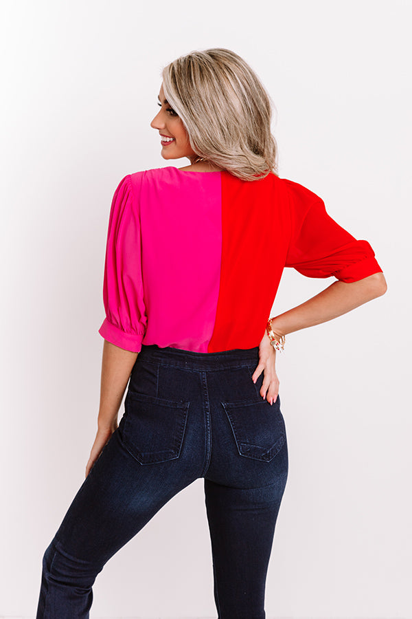 You will belong in the spotlight when you wear this spectacular 2-tone bodysuit featuring lightweight material with red and hot pink color block halves, short bubble sleeves with fitted cuffs, a faux wrap bodice with a v-cut neckline, and a flattering silhouette that ends in cheeky fit bottoms with a snap button closure!