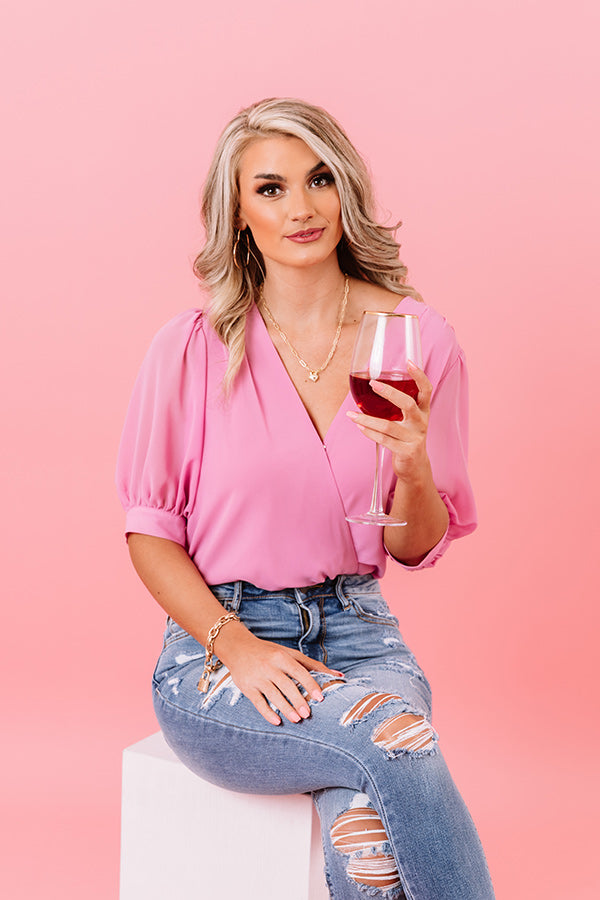 You will belong in the spotlight when you wear this spectacular pink bodysuit featuring lightweight material, short bubble sleeves with fitted cuffs, a faux wrap bodice with a v-cut neckline, and a flattering silhouette that ends in cheeky fit bottoms with a snap button closure!