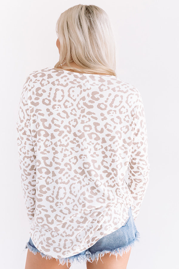 You won't believe what we just spotted...our new fave transitional top! It features lightweight ivory colored material patterned with a neutral leopard print, a wide v-cut neckline, long loose sleeves, and a relaxed silhouette that falls into a rounded hemline! We have styled this cutie with some distressed denim shorts, a neutral clutch, and a stone hued wedged bootie and statement necklace, but you can also wear it with some light wash flares, "The Jess Faux Leather Heel in Warm Taupe," and our "Sippin' At Sunset Sunnies in White!" Measurements