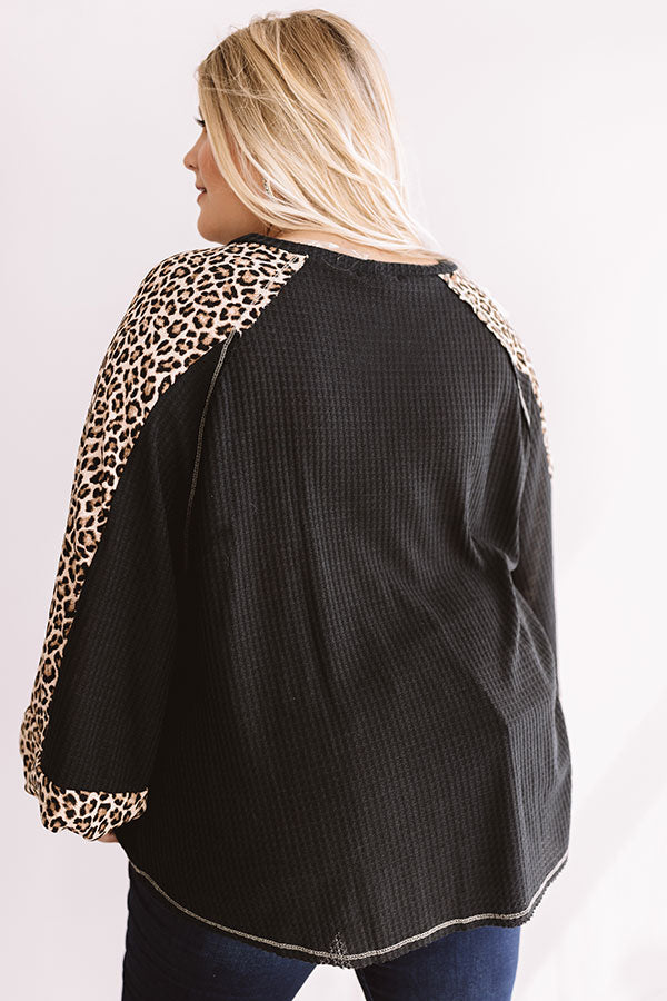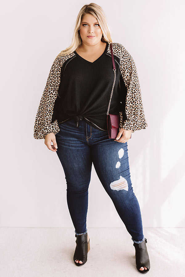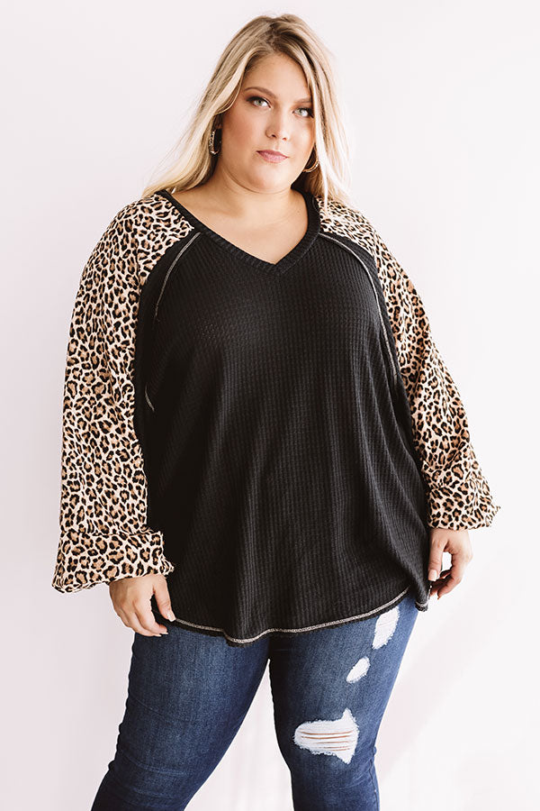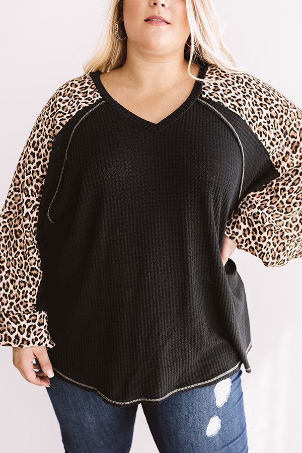Plus Size - "Spotted in Brooklyn:" an impressions girl wearing the perfect black shift top featuring a waffle knit texture, leopard print long bishop sleeves with elastic banded cuffs, a v-cut neckline, exposed seams, and a relaxed bodice that falls into a rounded hemline! We have styled this unique piece with some distressed ankle skinnies, a neutral cutout heel, and a maroon crossbody and faux suede hat, but you can also wear it front tucked into a wine colored fall skirt, "The Lynn Over The Knee Boot in Black," and our "Stargazing Earrings in Wine!" Measurements