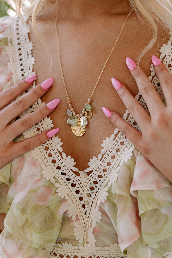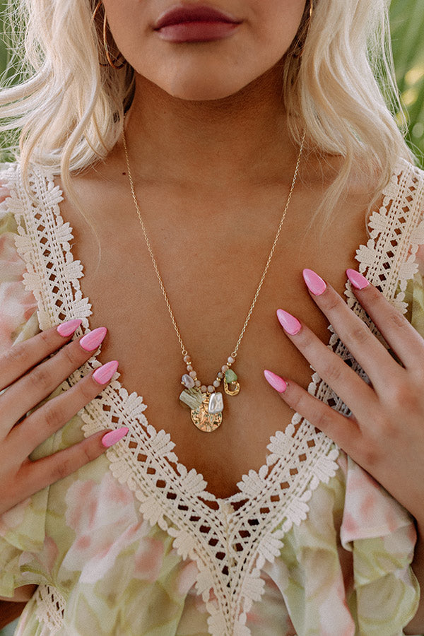 Cure your spring fever with this gorgeous necklace featuring a long dainty chain with a gold stamped pendant and stone bead charm!