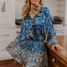 - This fabulous mini dress will put a little spring in your step! With its gorgeous floral satin material and flirty tiered design, this cutie is sure to turn heads. - Unlined satin-finished material with an ocean blue and stone colored floral print - Pleated accents - A smocked v-cut neckline with a tie and ruffle detailing - Long sleeves with elastic ruffle cuffs - A wide smocked waistline for a cinched look - A flowy and flattering silhouette that ends in an unfinished, mini dress length hemline