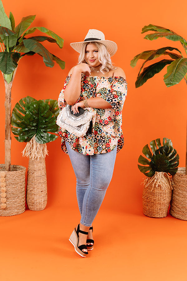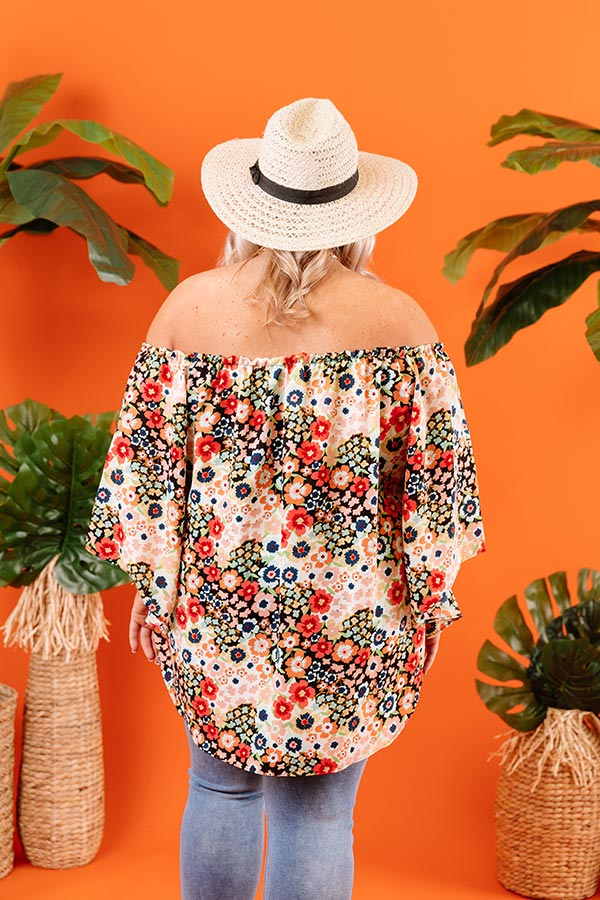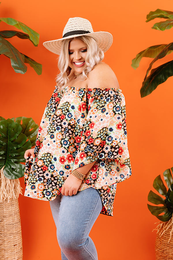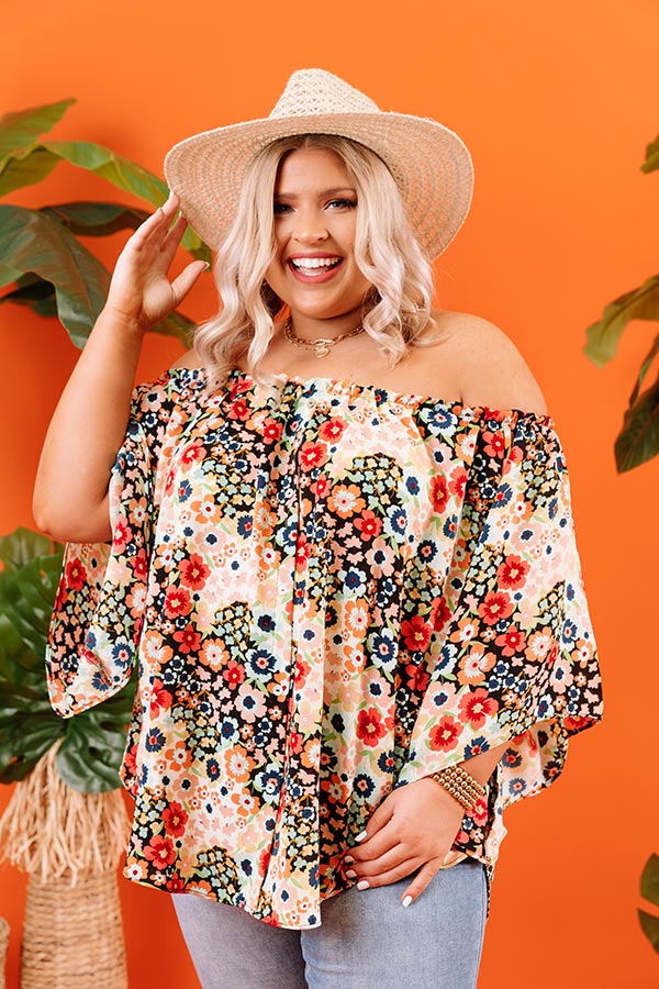 Plus Size - Spend your spring in the city in style with this stunning shift top featuring lightweight flowy material patterned with an intricate black, peach, red, light green, and blue hued floral print, an off shoulder fit with a straight elastic hemline, oversized drop sleeves, and a relaxed silhouette that ends in a straight hemline! Measurements
