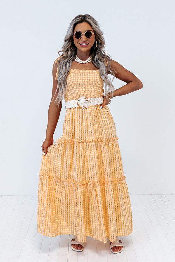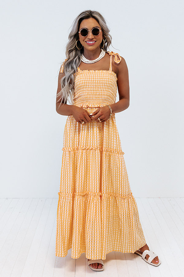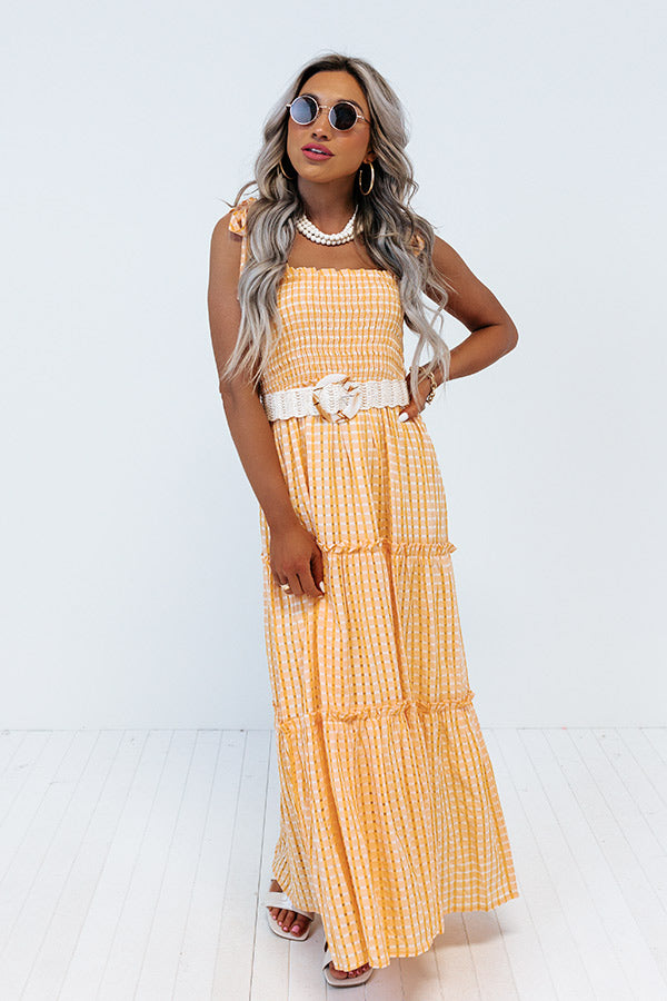 Spring into style with this adorable dress featuring lightweight material patterned with a orange and white gingham print, a smocked bodice with a straight neckline, tie closure spaghetti straps, accent ruffle seams, and a relaxed tiered skirt silhouette that falls into a straight ankle-length hemline! on products
