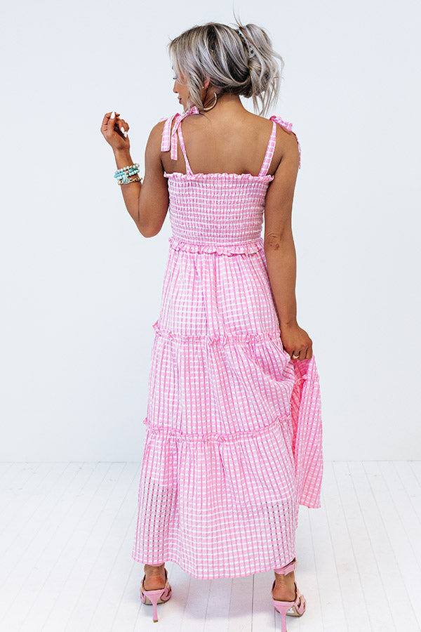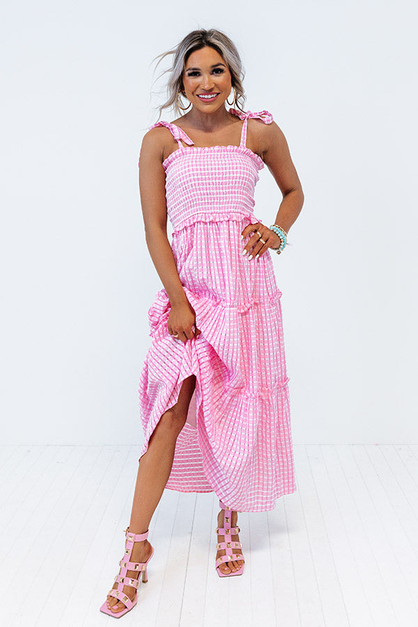 Spring into style with this adorable dress featuring lightweight material patterned with a pink and white gingham print, a smocked bodice with a straight neckline, tie closure spaghetti straps, accent ruffle seams, and a relaxed tiered skirt silhouette that falls into a straight ankle-length hemline! on products