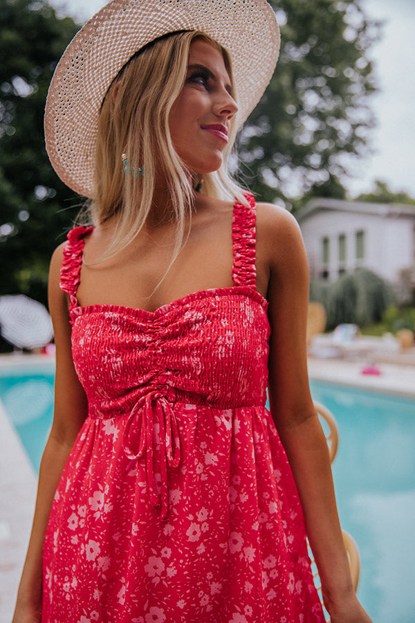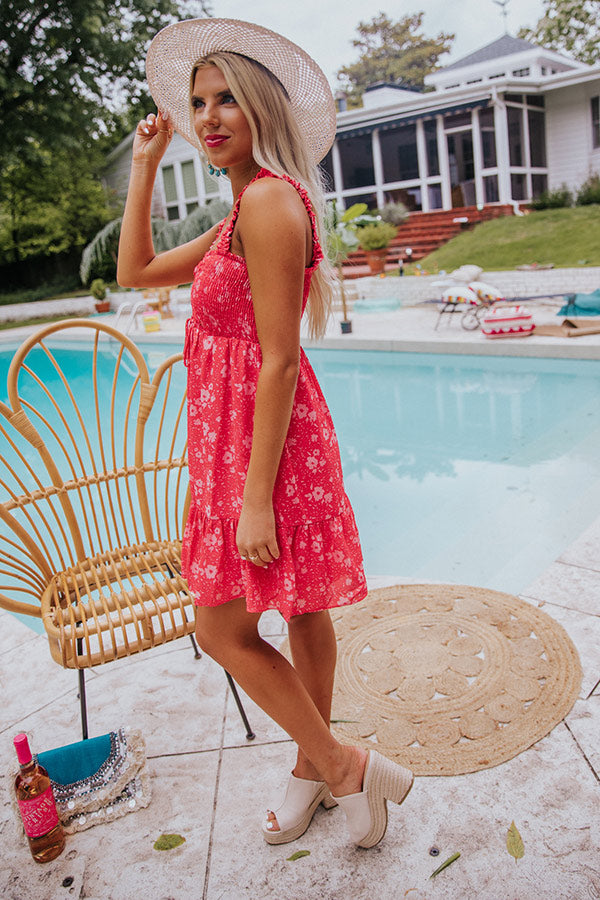 Spring into style with this darling raspberry hued dress featuring lightweight material patterned with a small floral print, a flirty sweetheart neckline with a front tie closure ruched detail, ruffled shoulder straps with a smocked back, and a relaxed skirt silhouette that falls into an uneven mid-thigh length peplum hemline! Measurements
