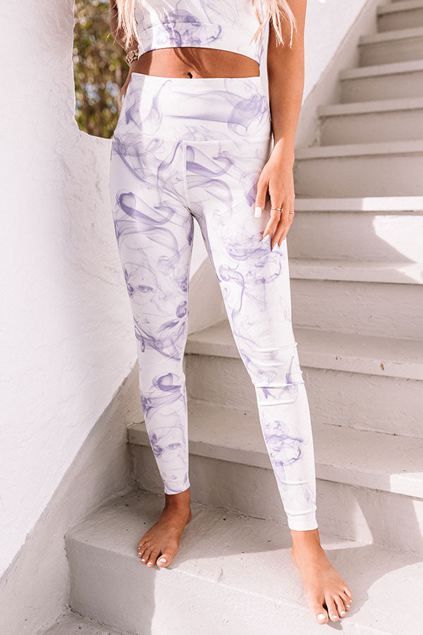 Upgrade your summer athleisure wear with our trendy white 'Sprinting And Spritzers' active legging featuring lightweight four-way stretchy material patterned with an abstract lavender print, a high waistline for tummy control, and a flattering form fitting silhouette that ends in ankle-length hemlines! Measurements