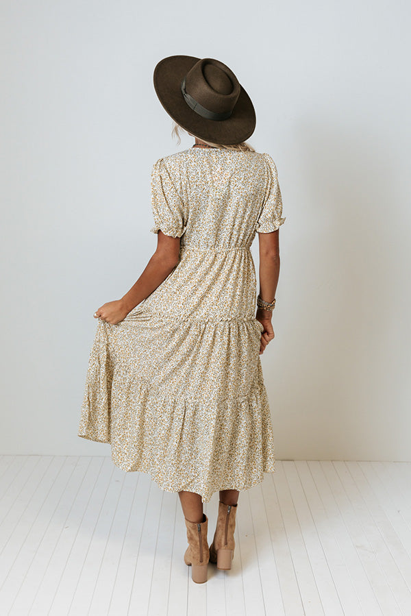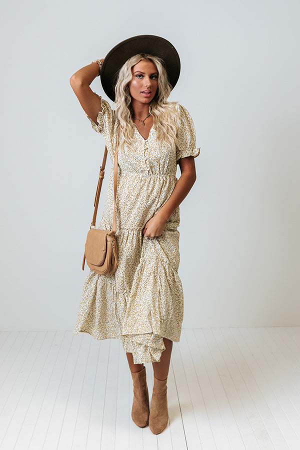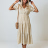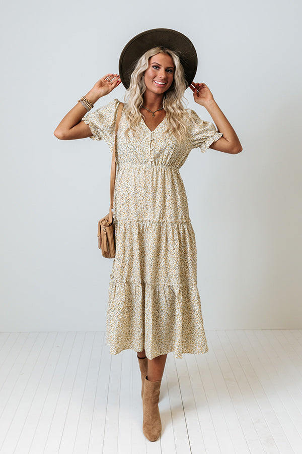 Strike a pose in our adorable 'Squeeze My Hand Midi' dress featuring lightweight flowy material patterned with a small brown spotted print, a button up bodice with a v-cut neckline, short puff sleeves, a cinched waistline, and a relaxed tiered skirt silhouette that falls into a straight mid-calf length hemline! Measurements