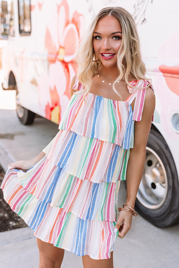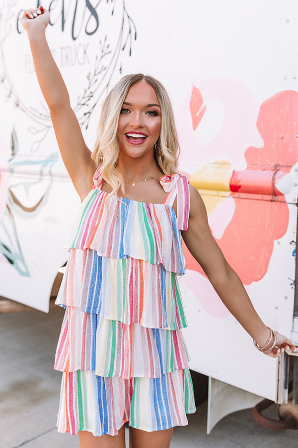 You are sure to look like a total "St. Barts Babe" when you wear this adorable dress featuring lightweight breezy material patterned with rainbow hued accent stripes, a straight neckline and upper back, tied 1-inch shoulder straps, and a relaxed ruffled silhouette that falls into an uneven mid-thigh length hemline! You can style this colorful summer piece a variety of ways, like with some matching green heels and a woven tote, but you can also wear it with "The Roxana Lace Up Wedge in Hot Pink" and our "Cabana Fever Tassel Earrings in Sky Blue!" Measurements