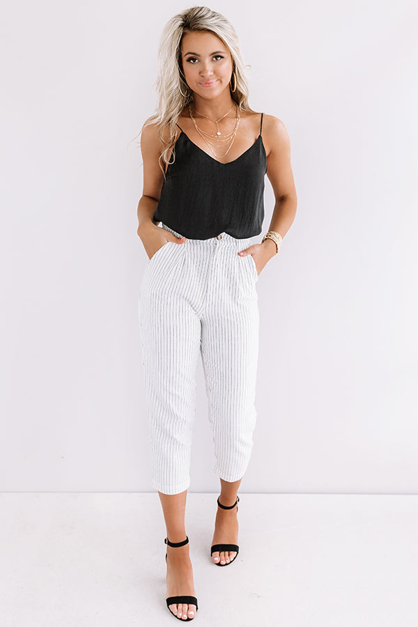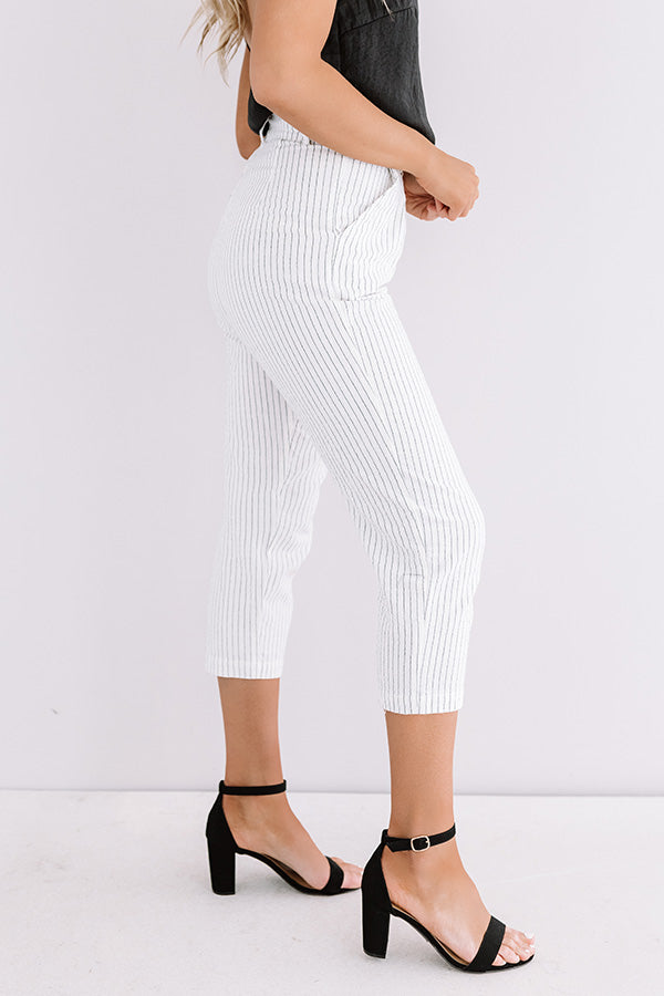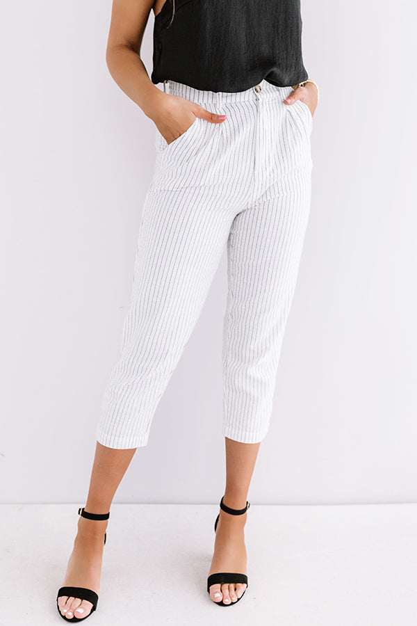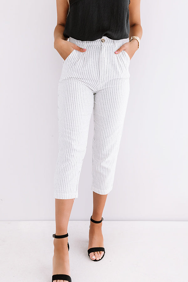 Strut around in high fashion with our darling white "St. Barts Brunch" trousers featuring lightweight material patterned with vertical pin stripes, a high waistline with belt loops, accent side pockets, a hidden zip with a button closure, and a figure flattering silhouette that falls into straight mid-calf length hemlines! We have styled these cuties for the work day with a basic black tank under a white blazer, a statement belt, and simple heels, but you can also wear it dressed down with "The Bags Under My Eyes Shift Tee in Black," our "Shine Brighter Sneaker in Silver," and our "Exciting Sights Metallic Pinstripe Backpack in Silver!" Measurements