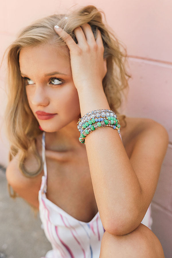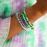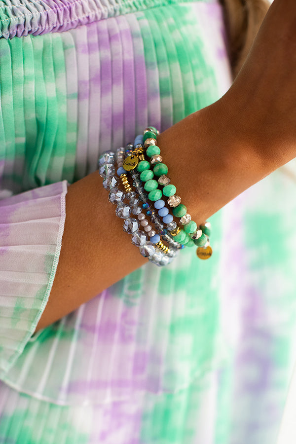 You will surely turn heads when you accessorize with our adorable "St. Martin Bracelet Set" featuring five pieces adorned with turquoise, purple, and gold beads with elastic silhouettes!