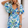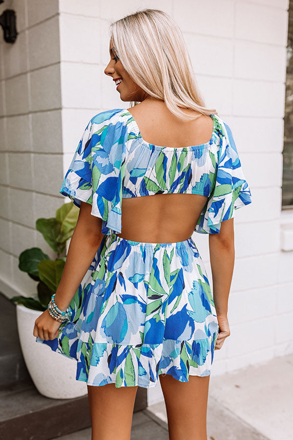 You are guaranteed to stand out when you arrive in this beautiful dress featuring lightweight material patterned with a royal blue, light blue, and light green hued leaf print, a v-cut neckline with a tie closure, short loose sleeves, flattering side cutouts, and a relaxed skirt silhouette that falls into a straight mid-thigh length hemline!