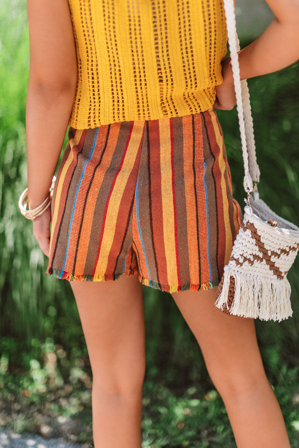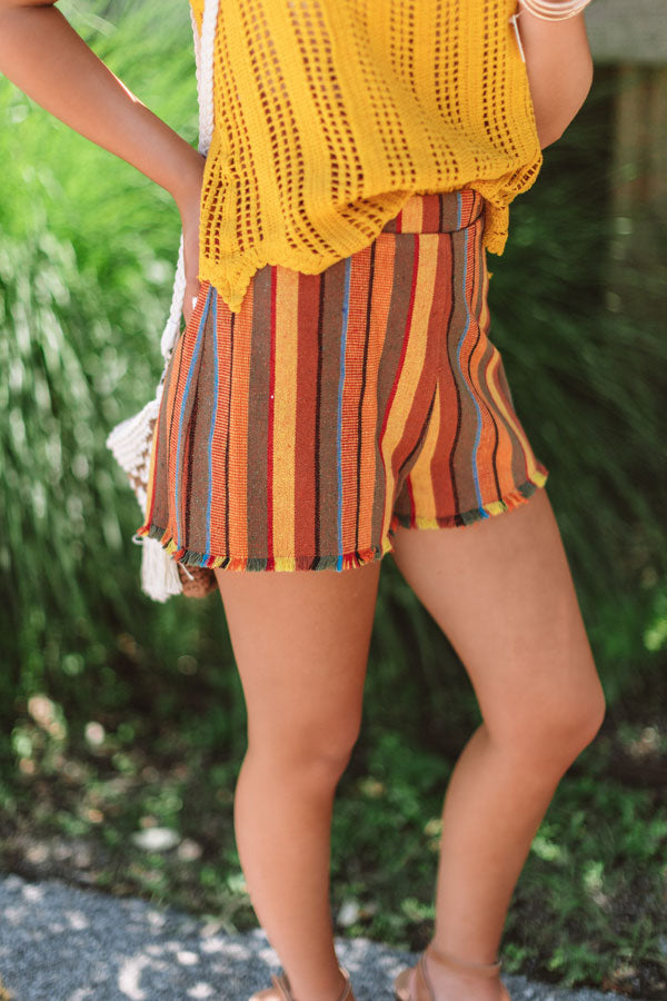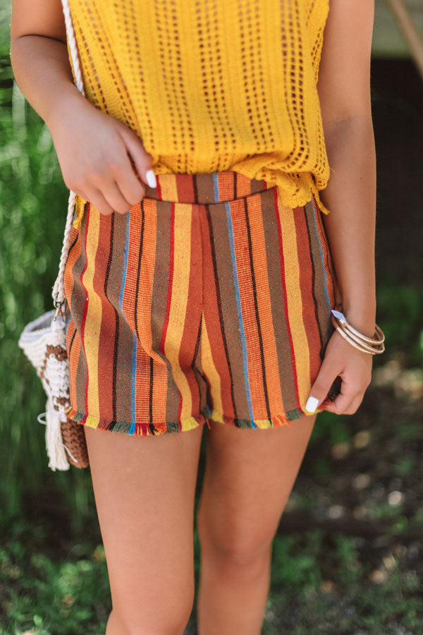 These unique shorts will have your summer style receiving a standing ovation with their high waist fit and vibrant stripes! Pair with a knit tank, a woven bag, and neutral wedges for a perfect warm weather concert outfit! Measurements