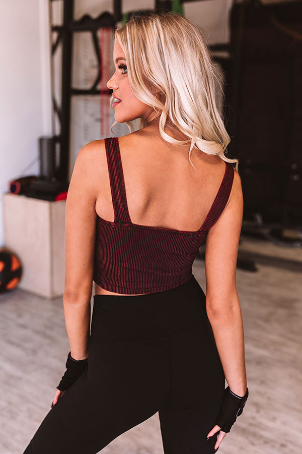 You are sure to look like a star when you arrive in this sporty maroon crop top featuring sleek lightweight four-way stretch material with subtle ribbed texturing, a scooped neckline, skinny sleeveless shoulder straps with a low open square back, and a flattering figure hugging silhouette that ends in a straight cropped hemline!