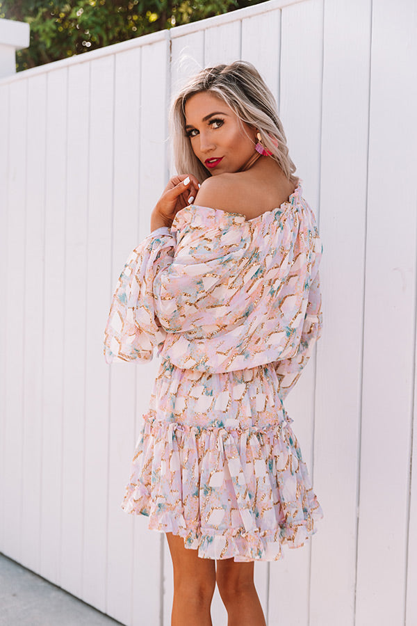 You are guaranteed to be the "star of the show" when you wear this stunning pink dress featuring lightweight material patterned with a pastel scalloped print with gold accents, a v-cut neckline with a tie closure, long loose sleeves with oversized flared cuffs starting at the elbow, ruffled trim and seam detailing, and a fitted smocked waistband that falls into a tiered silhouette with an uneven mid-thigh length hemline! We have styled this gorgeous piece with some matching heels, but you can also wear it with "The Becca Espadrille in Gold" and our "Cute As Can Be Clutch in Gold!"